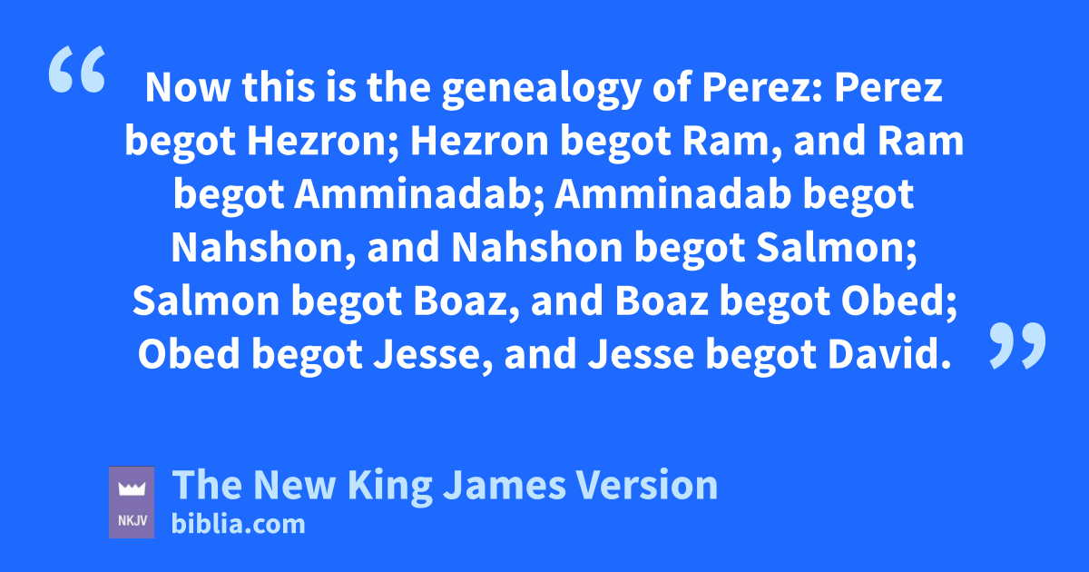 18 wNow this is the genealogy of Perez: xPerez begot Hezron; 19 Hezron begot Ram, and Ram begot Amminadab; 20 Amminadab begot yNahshon, and Nahshon begot zSalmon; 821 Salmon begot Boaz, and Boaz begot Obed; 22 Obed begot Jesse, and Jesse begot aDavid.