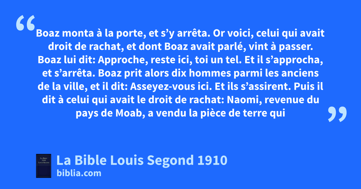 1Boaz monta à la porte, et s’y arrêta. Or voici, celui qui avait droit de rachat, et dont Boaz avait parlé, vint à passer. Boaz lui dit: Approche, reste ici, toi un tel. Et il s’approcha, et s’arrêta. 2Boaz prit alors dix hommes parmi les anciens de la ville, et il dit: Asseyez-vous ici. Et ils s’assirent. 3Puis il dit à celui qui avait le droit de rachat: Naomi, revenue du pays de Moab, a vendu la pièce de terre qui appartenait à notre frère Élimélec. 4J’ai cru devoir t’en informer, et te dire: Acquiers-la, en présence des habitants et en présence des anciens de mon peuple. Si tu veux racheter, rachète; mais si tu ne veux pas, déclare-le-moi, afin que je le sache. Car il n’y a personne avant toi qui ait le droit de rachat, et je l’ai après toi. Et il répondit: je rachèterai. 5Boaz dit: Le jour où tu acquerras le champ de la main de Naomi, tu l’acquerras en même temps de Ruth la Moabite, femme du défunt, pour relever le nom du défunt dans son héritage. 6Et celui qui avait le droit de rachat répondit: Je ne puis pas racheter pour mon compte, crainte de détruire mon héritage; prends pour toi mon droit de rachat, car je ne puis pas racheter. 7aAutrefois en Israël, pour valider une affaire quelconque relative à un rachat ou à un échange, l’un ôtait son soulier et le donnait à l’autre: cela servait de témoignage en Israël. 8Celui qui avait le droit de rachat dit donc à Boaz: Acquiers pour ton compte! Et il ôta son soulier. 9Alors Boaz dit aux anciens et à tout le peuple: Vous êtes témoins aujourd’hui que j’ai acquis de la main de Naomi tout ce qui appartenait à Élimélec, à Kiljon et à Machlon, 10et que je me suis également acquis pour femme Ruth la Moabite, femme de Machlon, pour relever le nom du défunt dans son héritage, et afin que le nom du défunt ne soit point retranché d’entre ses frères et de la porte de son lieu. Vous en êtes témoins aujourd’hui! 11Tout le peuple qui était à la porte et les anciens dirent: Nous en sommes témoins! Que l’Éternel rende la femme qui entre dans ta maison semblable à bRachel et à Léa, qui toutes les deux ont bâti la maison d’Israël! Manifeste ta force dans Éphrata, et fais-toi un nom dans Bethléhem! 12Puisse la postérité que l’Éternel te donnera par cette jeune femme rendre ta maison semblable à la maison de cPérets, qui fut enfanté à Juda par Tamar!
