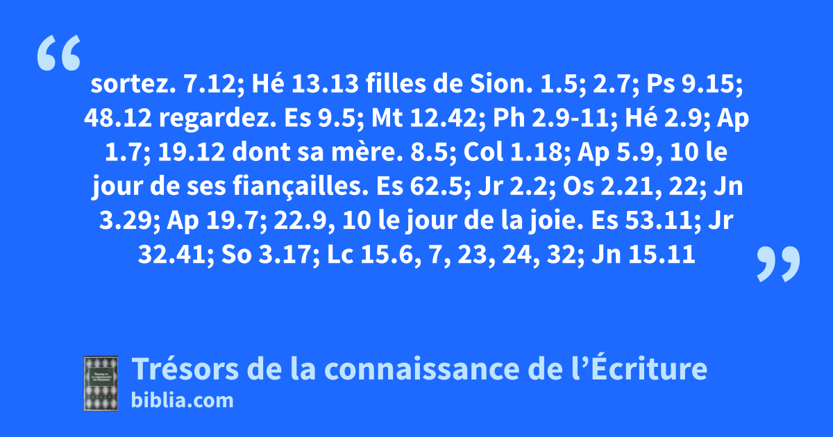 sortez. 7.12; Hé 13.13 filles de Sion. 1.5; 2.7; Ps 9.15; 48.12 regardez. Es 9.5; Mt 12.42; Ph 2.9-11; Hé 2.9; Ap 1.7; 19.12 dont sa mère. 8.5; Col 1.18; Ap 5.9, 10 le jour de ses fiançailles. Es 62.5; Jr 2.2; Os 2.21, 22; Jn 3.29; Ap 19.7; 22.9, 10 le jour de la joie. Es 53.11; Jr 32.41; So 3.17; Lc 15.6, 7, 23, 24, 32; Jn 15.11