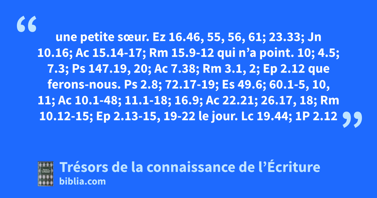 une petite sœur. Ez 16.46, 55, 56, 61; 23.33; Jn 10.16; Ac 15.14-17; Rm 15.9-12 qui n’a point. 10; 4.5; 7.3; Ps 147.19, 20; Ac 7.38; Rm 3.1, 2; Ep 2.12 que ferons-nous. Ps 2.8; 72.17-19; Es 49.6; 60.1-5, 10, 11; Ac 10.1-48; 11.1-18; 16.9; Ac 22.21; 26.17, 18; Rm 10.12-15; Ep 2.13-15, 19-22 le jour. Lc 19.44; 1P 2.12