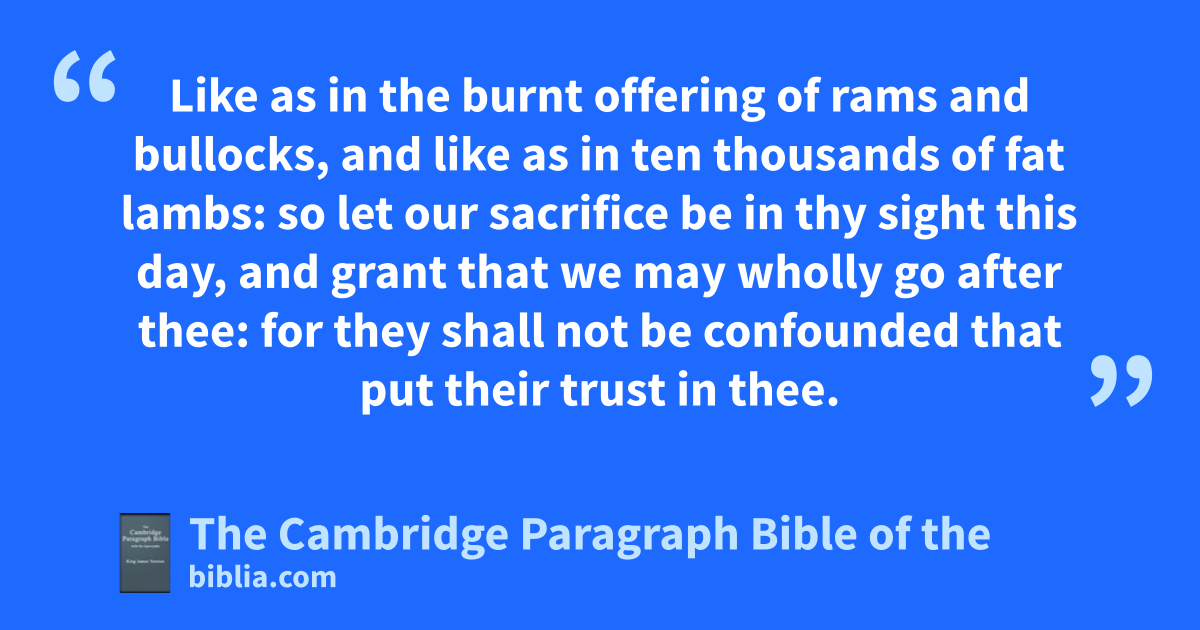 3 bbBlessed art thou, O Lord God of our fathers: thy name is worthy to be praised and glorified for evermore: 4 for cthou art righteous in all the things that thou hast done to us: yea, true are all thy works, dthy ways are right, and dall thy judgments are truth. 5 In all the things that thou hast brought upon us, and upon ethe holy city of our fathers, even Jerusalem, thou hast executed true judgment: for according to truth and judgment didst thou bring all these things upon us because of our sins. 6 For fwe have sinned and committed iniquity, departing from thee. 7 In all things have we trespassed, and not obeyed thy commandments, nor kept them, neither done as thou hast commanded us, gthat it might go well with us. 8 Wherefore all that thou hast brought upon us, and every thing that thou hast done to us, thou hast done in true judgment. 9 And thou didst deliver us into the hands of lawless enemies, most hateful ggforsakers of God, and to han unjust king, and the most wicked in all the world. 10 And now we cannot open our mouths, iwe are become a shame and reproach to thy servants, and to them that worship thee. 11 Yet deliver us not up jwholly, for thy name’s sake, neither kdisannul thou thy covenant: 12 and cause not thy mercy to depart from us, for lthy beloved Abraham’s sake, for thy servant Isaac’s sake, and for thy holy Israel’s sake; 13 to whom thou hast spoken and promised, mthat thou wouldest multiply their seed as the stars of heaven, and mas the sand that lieth upon the sea shore. 14 For nwe, O oLord, are become less than any nation, and be kept under this day in all the world because of our sins. 15 Neither is there at this time prince, por prophet, or leader, or burnt offering, or sacrifice, or oblation, or incense, or qplace to sacrifice before thee, and to find mercy. 16 Nevertheless in ra contrite heart and an humble spirit let us be accepted. 17 sLike as in the burnt offering of rams and bullocks, and like as in ten thousands of fat lambs: so slet our sacrifice be in thy sight this day, and grant that we may twholly go after thee: for uthey shall not be confounded that put their trust in thee. 18 And now we follow thee with all our heart, we fear thee, and seek thy face. 19 uPut us not to shame: but xdeal with us after thy ylovingkindness, and according to the multitude of thy mercies. 20 Deliver us also according to thy marvellous works, and zgive glory to thy name, O Lord: and let all them that do thy servants hurt be ashamed; 21 and let them be confounded * in all their power and might, and let their strength be broken; 22 and alet them know that thou art Lord, the only God, and glorious over bthe whole world.