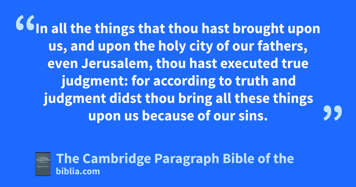 3 bbBlessed art thou, O Lord God of our fathers: thy name is worthy to be praised and glorified for evermore: 4 for cthou art righteous in all the things that thou hast done to us: yea, true are all thy works, dthy ways are right, and dall thy judgments are truth. 5 In all the things that thou hast brought upon us, and upon ethe holy city of our fathers, even Jerusalem, thou hast executed true judgment: for according to truth and judgment didst thou bring all these things upon us because of our sins. 6 For fwe have sinned and committed iniquity, departing from thee. 7 In all things have we trespassed, and not obeyed thy commandments, nor kept them, neither done as thou hast commanded us, gthat it might go well with us. 8 Wherefore all that thou hast brought upon us, and every thing that thou hast done to us, thou hast done in true judgment. 9 And thou didst deliver us into the hands of lawless enemies, most hateful ggforsakers of God, and to han unjust king, and the most wicked in all the world. 10 And now we cannot open our mouths, iwe are become a shame and reproach to thy servants, and to them that worship thee. 11 Yet deliver us not up jwholly, for thy name’s sake, neither kdisannul thou thy covenant: 12 and cause not thy mercy to depart from us, for lthy beloved Abraham’s sake, for thy servant Isaac’s sake, and for thy holy Israel’s sake; 13 to whom thou hast spoken and promised, mthat thou wouldest multiply their seed as the stars of heaven, and mas the sand that lieth upon the sea shore. 14 For nwe, O oLord, are become less than any nation, and be kept under this day in all the world because of our sins. 15 Neither is there at this time prince, por prophet, or leader, or burnt offering, or sacrifice, or oblation, or incense, or qplace to sacrifice before thee, and to find mercy. 16 Nevertheless in ra contrite heart and an humble spirit let us be accepted. 17 sLike as in the burnt offering of rams and bullocks, and like as in ten thousands of fat lambs: so slet our sacrifice be in thy sight this day, and grant that we may twholly go after thee: for uthey shall not be confounded that put their trust in thee. 18 And now we follow thee with all our heart, we fear thee, and seek thy face. 19 uPut us not to shame: but xdeal with us after thy ylovingkindness, and according to the multitude of thy mercies. 20 Deliver us also according to thy marvellous works, and zgive glory to thy name, O Lord: and let all them that do thy servants hurt be ashamed; 21 and let them be confounded * in all their power and might, and let their strength be broken; 22 and alet them know that thou art Lord, the only God, and glorious over bthe whole world.