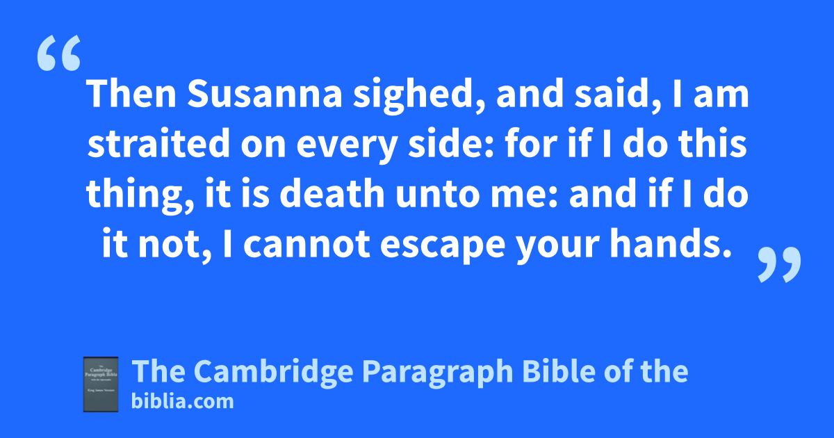 15 And it fell out, as they watched a ofit time, she went in * as before with two maids only, and she was desirous to wash herself in the egarden: for it was hot. 16 And there was no body there save the two elders, that had hid themselves, and watched her. 17 Then she said to her maids, Bring me oil and washing balls, and shut the egarden doors, that I may wash me. 18 And they did as she bade them, and shut the egarden doors, and went out themselves at * privy doors to fetch the things that she had commanded them: but they saw not the elders, because they were hid. 19 Now when the maids were gone forth, the two elders rose up, and ran unto her, saying, 20 Behold, the garden doors are shut, that no man can see us, and we are in love with thee; therefore consent unto us, and lie with us. 21 If thou wilt not, we will bear witness against thee, that a young man was with thee: and therefore thou didst send away thy maids from thee. 22 Then Susanna psighed, and said, I am straited on every side: for if I do this thing, qit is death unto me: and if I do it not, I cannot escape your hands. 23 It is better for me to fall into your hands, and not do it, than to sin in the sight of the Lord. 24 With that Susanna cried with a loud voice: and the two elders cried out against her. 25 Then ran the one, and opened the garden door. 26 So when the servants of the house heard the cry in the garden, they rushed in at a rprivy door, to see what was done unto her. 27 But when the elders had declared their matter, the servants were greatly ashamed: for there was never such a report made of Susanna.