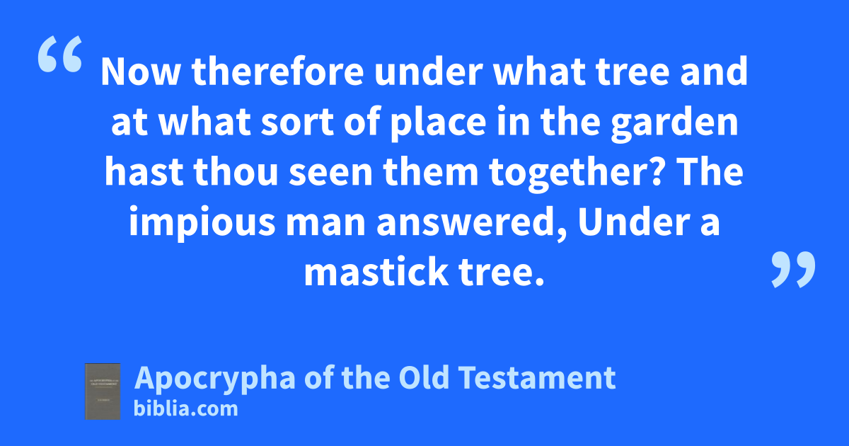 ¶54 Now therefore under what tree and at what sort of place in the garden hast thou seen them together? The impious man answered, Under a mastick tree. | (54) Now then, if thou sawest her, tell me, Under what tree sawest thou them companying together? Who answered, Under a mastick tree. |