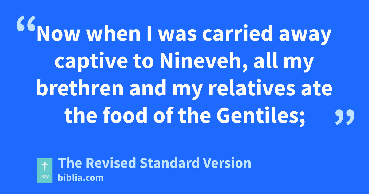 10 Now when I was carried away captive to Nineveh, all my brethren and my relatives ate the food of the Gentiles; 11 but I kept myself from eating it, 12 because I remembered God with all my heart. 13 Then the Most High gave me favor and good appearance in the sight of Shalmaneser, and I was his buyer of provisions. 14 So I used to go into Media, and once at Rages in Media I left ten talents of silver in trust with Gabael, the brother of Gabrias. 15 But when Shalmaneser died, Sennacherib his son reigned in his place; and under him the highways were unsafe, so that I could no longer go into Media.