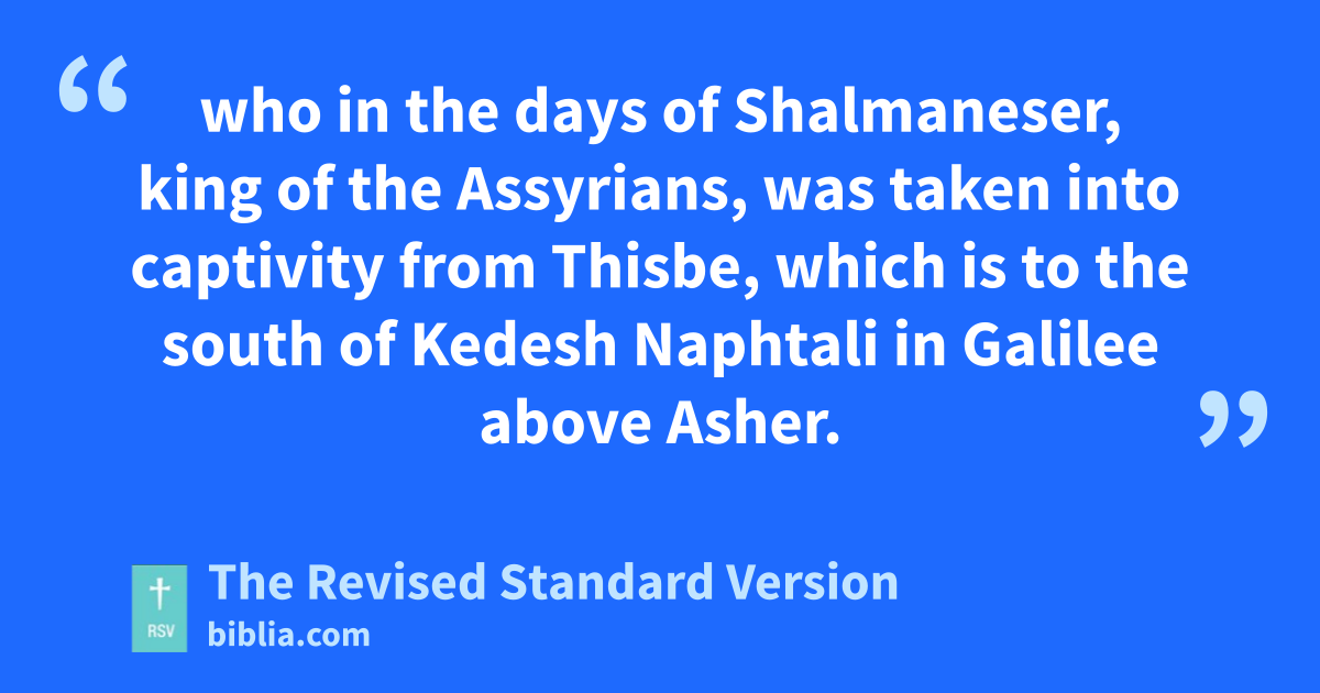 1 The book of the acts of Tobit the son of Tobiel, son of Ananiel, son of Aduel, son of Gabael, of the descendants of Asiel and the tribe of Naphtali, 2 who in the days of Shalmaneser, king of the Assyrians, was taken into captivity from Thisbe, which is to the south of Kedesh Naphtali in Galilee above Asher.