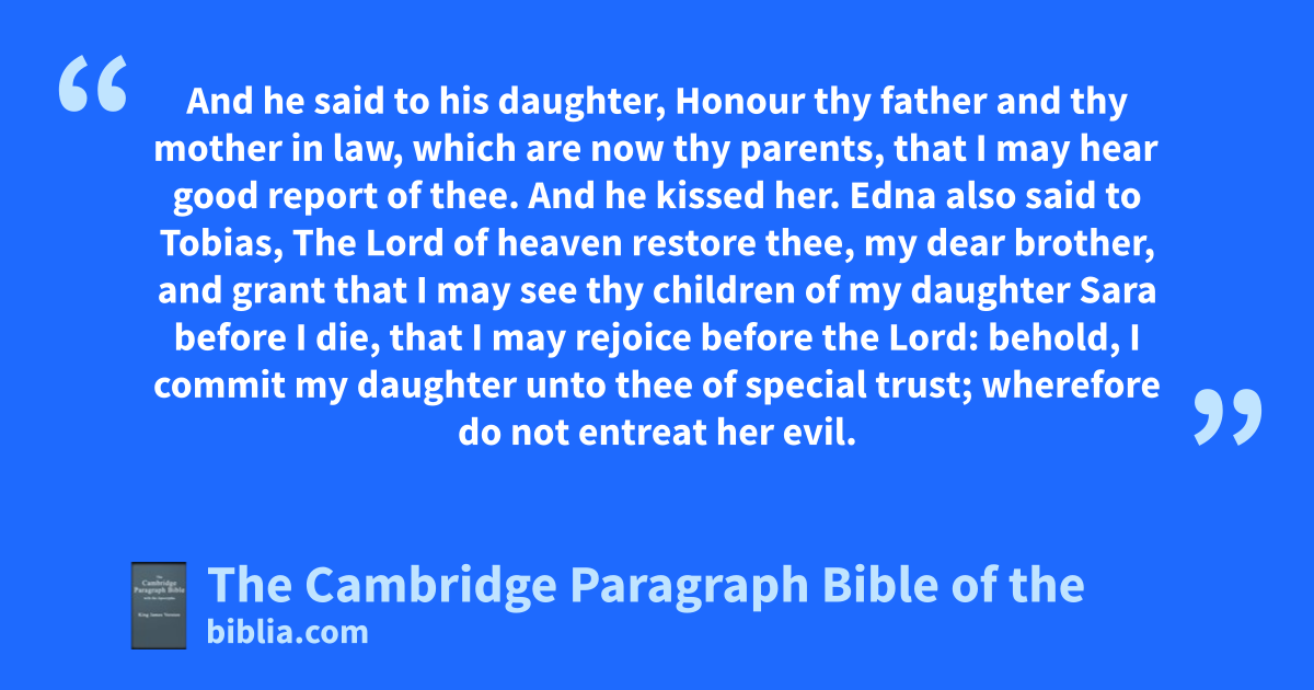 Then Tobias said to Raguel, Let me go, for my father and my mother look no more to see me. 8 But his father in law said unto him, Tarry with me, and I will send to thy father, and they shall declare unto him how things go with thee. 9 But Tobias said, No; but let me go to my father. 10 Then Raguel arose, and gave him Sara his wife, and dhalf his goods, eservants, and cattle, and money: 11 and he blessed them, and sent them away, saying, The God of heaven give you a prosperous journey, my children. 12 And he said to his daughter, Honour thy father and thy mother in law, which are now thy parents, that I may hear good report of thee. And he kissed her. Edna also said to Tobias, The Lord of heaven restore thee, my dear brother, and grant that I may see thy children of my daughter Sara before I die, that I may rejoice before the Lord: behold, I fcommit my daughter unto thee * of special trust; wherefore do not entreat her evil.