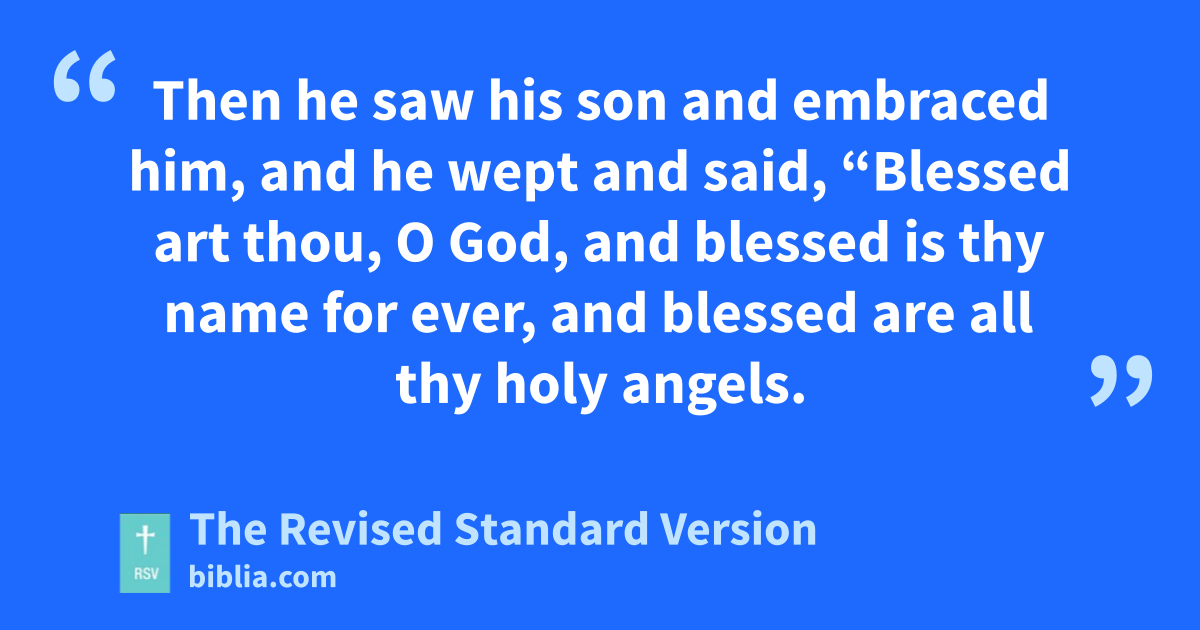 9 Then Anna ran to meet them, and embraced her son, and said to him, “I have seen you, my child; now I am ready to die.” And they both wept. 10 Tobit started toward the door, and stumbled. But his son ran to him 11 and took hold of his father, and he sprinkled the gall upon his father’s eyes, saying, “Be of good cheer, father.” 12 And when his eyes began to smart he rubbed them, 13 and the white films scaled off from the corners of his eyes. 14 Then he saw his son and embraced him, and he wept and said, “Blessed art thou, O God, and blessed is thy name for ever, and blessed are all thy holy angels. 15 For thou hast afflicted me, but thou hast had mercy upon me; here I see my son Tobias!” And his son went in rejoicing, and he reported to his father the great things that had happened to him in Media.