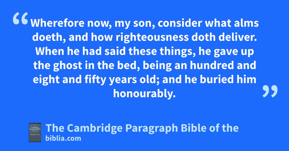 XIV. So Tobit made an end of apraising God. 2 And he was eight and fifty years old when he lost his sight, which was restored to him after eight years: and he gave alms, and he * increased in the fear of the Lord God, and apraised him. 3 And when he was very aged, he called his son, and the six sons of his son, and said to him, My son, take thy children; for behold, I am aged, and am ready to depart out of this life. 4 Go into bMedia, my son, for I surely believe those things which cJonas the prophet spake of Nineve, that it shall be overthrown; and that for a time peace shall rather be in Media; and that dour brethren shall lie scattered in the earth from that good land: and dJerusalem shall be desolate, and dthe house of God in it shall be burned, and shall be desolate for a time; 5 and that again God will have mercy on them, and bring them again into the land, where ethey shall build a temple, but fnot like to the first, until the time of that age be fulfilled; and gafterward they shall return from all places of their captivity, and build up Jerusalem gloriously, and the house of God shall be built in it * for ever with a glorious building, as the prophets have spoken thereof. 6 And hall nations shall turn, and fear the Lord God truly, and ishall bury their idols. 7 So shall all nations praise the Lord, and his people shall aconfess God, and the Lord shall exalt his people; and all kthose which love the Lord God in truth and justice shall rejoice, shewing mercy to our brethren. 8 And now, my son, depart out of Nineve, because that those things which cthe prophet Jonas spake shall surely come to pass. 9 But keep thou the law and the commandments, and shew thyself merciful and just, lthat it may go well with thee. 10 And bury me decently, and thy mother with me; but tarry no longer at Nineve. Remember, my son, how Aman handled mAchiacharus that brought him up, how nout of light he brought him into darkness, and how he rewarded him again: yet Achiacharus was * saved, but the other had his reward: for he went down into darkness. * Manasses gave alms, and escaped the snares of death * which they had set for him: but Aman fell into the snare, and perished. 11 Wherefore now, my son, consider owhat alms doeth, and how righteousness doth deliver.