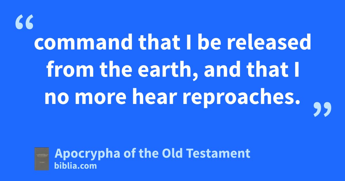 7 On this day it happened unto Sarah the daughter of Raguel who was in Ecbatana of Media, that she also heard reproaches by one of her father’s maidservants; 8 because that she had been given to seven husbands, and Asmodaeus the evil demon had slain them, before they had been with her as it is appointed for women. And the maidservant said unto her, It is thou that slayest thy husbands; behold thou hast already been given to seven husbands, and thou hast not been named of one of them. 9 Wherefore dost thou scourge us on account of thy husbands because they have died? Go thy ways with them and let us see neither son nor daughter of thine for ever. 10 In that day she was grieved in her soul and wept; and she went up into her father’s upper room, and desired to hang herself; and again she considered and said, Nay, lest they reproach my father; and shall say unto him, Thou hadst one beloved daughter, and she hath hanged herself because of her calamities! and I shall bring down my father’s old age with sorrow to Hades. It is fitter for me not to hang myself, but to supplicate the Lord that I may die and no longer hear reproaches during my life. 11 At the self-same time she stretched forth her hands towards the window and prayed, and said, Blessed art thou, O merciful God, and blessed is thy name for ever: and let all thy works bless thee for ever. 12 And now unto thee my face and mine eyes I lift up: 13 command that I be released from the earth, and that I no more hear reproaches. 14 Thou knowest, Master, that I am pure from all uncleanness with man, 15 and that I never polluted my name, nor the name of my father either, in the land of my captivity. I am the only daughter of my father, and he hath no other child to be his heir, nor has he kinsman near him, nor has he relation, that I should keep myself for a wife unto him. Seven husbands of mine are dead already; and why should it be mine to live on? And if it pleaseth thee not to slay me—O Lord, now hear my reproach.