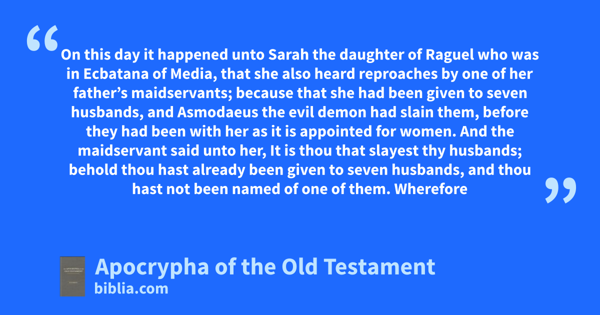 7 On this day it happened unto Sarah the daughter of Raguel who was in Ecbatana of Media, that she also heard reproaches by one of her father’s maidservants; 8 because that she had been given to seven husbands, and Asmodaeus the evil demon had slain them, before they had been with her as it is appointed for women. And the maidservant said unto her, It is thou that slayest thy husbands; behold thou hast already been given to seven husbands, and thou hast not been named of one of them. 9 Wherefore dost thou scourge us on account of thy husbands because they have died? Go thy ways with them and let us see neither son nor daughter of thine for ever. 10 In that day she was grieved in her soul and wept; and she went up into her father’s upper room, and desired to hang herself; and again she considered and said, Nay, lest they reproach my father; and shall say unto him, Thou hadst one beloved daughter, and she hath hanged herself because of her calamities! and I shall bring down my father’s old age with sorrow to Hades. It is fitter for me not to hang myself, but to supplicate the Lord that I may die and no longer hear reproaches during my life. 11 At the self-same time she stretched forth her hands towards the window and prayed, and said, Blessed art thou, O merciful God, and blessed is thy name for ever: and let all thy works bless thee for ever. 12 And now unto thee my face and mine eyes I lift up: 13 command that I be released from the earth, and that I no more hear reproaches. 14 Thou knowest, Master, that I am pure from all uncleanness with man, 15 and that I never polluted my name, nor the name of my father either, in the land of my captivity. I am the only daughter of my father, and he hath no other child to be his heir, nor has he kinsman near him, nor has he relation, that I should keep myself for a wife unto him. Seven husbands of mine are dead already; and why should it be mine to live on? And if it pleaseth thee not to slay me—O Lord, now hear my reproach.