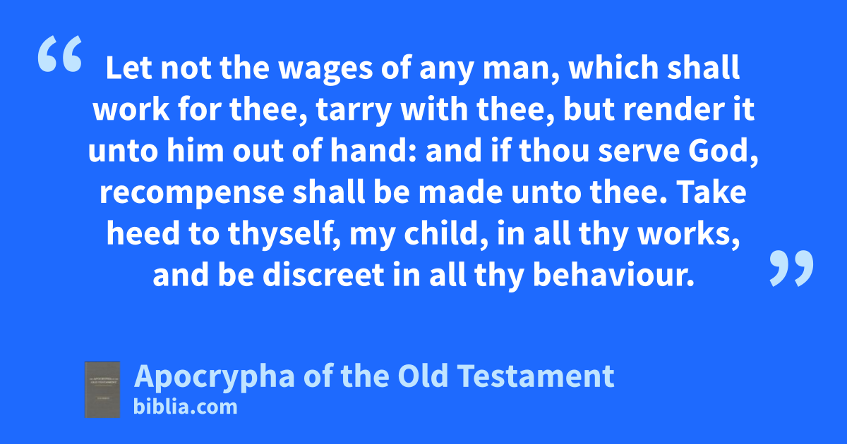 3 And he called Tobias his son and he came unto him and he said unto him, Bury me well, and honour thy mother; and forsake her not all the days of her life, and do that which is pleasing before her, and grieve not her spirit in any matter. 4 Remember her, child, that she hath experienced many dangers for thee in her womb; and when she is dead, bury her by me in one grave. 5 My child, be mindful of the Lord all thy days, and let not thy will be set to sin and to transgress his commandments: do acts of righteousness all the days of thy life, and walk not in the ways of unrighteousness. 6 〈 For if thou doest the truth, success shall be in thy works, and so it shall be unto all that do righteousness. 7 Give alms of thy substance: turn not away thy face from any poor man, and the face of God shall not be turned away from thee. 8 As thy substance is, give alms of it according to thine abundance: if thou have much, according to the abundance thereof, give alms; if thou have little bestow it, and be not afraid to give alms according to that little: 9 for thou layest up a good treasure for thyself against the day of necessity: 10 because alms delivereth from death, and suffereth not to come into darkness. 11 Alms is a good offering in the sight of the Most High for all that give it. 12 Beware, my child, of all whoredom, and take first a wife of the seed of thy fathers, take not a strange wife, which is not of thy father’s tribe; for we are the sons of the prophets. Noah, Abraham, Isaac, Jacob, our fathers of old time, remember, my child, that they all took wives of their kinsmen, and were blessed in their children, and their seed shall inherit the land. 13 And now, my child, love thy brethren, and scorn not in thy heart thy brethren and the sons and the daughters of thy people so as not to take one of them; for in scornfulness is destruction and much trouble, and in idleness is decay and great want, for idleness is the mother of famine. 14 Let not the wages of any man, which shall work for thee, tarry with thee, but render it unto him out of hand: and if thou serve God, recompense shall be made unto thee. Take heed to thyself, my child, in all thy works, and be discreet in all thy behaviour. 15 And what thou thyself hatest, do to no man. Drink not wine unto drunkenness, and let not drunkenness go with thee on thy way. 16 Give of thy bread to the hungry, and of thy garments to them that are naked: of all thine abundance give alms; and let not thine eye be grudging when thou givest alms. 17 Pour out thy bread and thy wine on the tomb of the just, and give not to sinners. 18 Ask counsel of every man that is wise, and despise not any counsel that is profitable. 19 And bless the Lord thy God at all times, and ask of him that thy ways may be made straight, and that all thy paths and counsels may prosper: for every nation hath not good counsel; 〈but〉 the Lord will give to them 〈all good things〉; and whom he will the Lord humbleth unto the nethermost Hades. And now, child, remember these commandments, and let them not be blotted out of thy heart. 20 And now, child, I shew thee that I left ten talents of silver in trust with Gabael the brother of Gabri at Rages of Media. 21 And fear not, my child, because we have become poor: thou hast much wealth, if thou fear God and avoid every kind of sin and do the things which are good in the sight of the Lord thy God.
