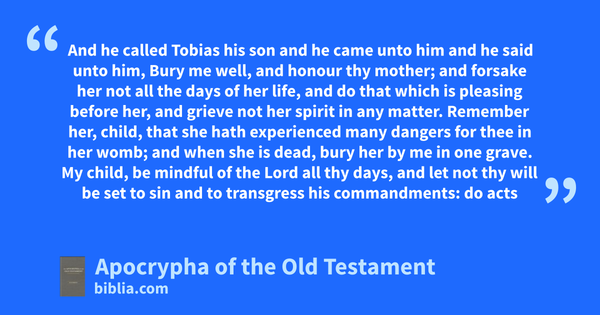 3 And he called Tobias his son and he came unto him and he said unto him, Bury me well, and honour thy mother; and forsake her not all the days of her life, and do that which is pleasing before her, and grieve not her spirit in any matter. 4 Remember her, child, that she hath experienced many dangers for thee in her womb; and when she is dead, bury her by me in one grave. 5 My child, be mindful of the Lord all thy days, and let not thy will be set to sin and to transgress his commandments: do acts of righteousness all the days of thy life, and walk not in the ways of unrighteousness. 6 〈 For if thou doest the truth, success shall be in thy works, and so it shall be unto all that do righteousness. 7 Give alms of thy substance: turn not away thy face from any poor man, and the face of God shall not be turned away from thee. 8 As thy substance is, give alms of it according to thine abundance: if thou have much, according to the abundance thereof, give alms; if thou have little bestow it, and be not afraid to give alms according to that little: 9 for thou layest up a good treasure for thyself against the day of necessity: 10 because alms delivereth from death, and suffereth not to come into darkness. 11 Alms is a good offering in the sight of the Most High for all that give it. 12 Beware, my child, of all whoredom, and take first a wife of the seed of thy fathers, take not a strange wife, which is not of thy father’s tribe; for we are the sons of the prophets. Noah, Abraham, Isaac, Jacob, our fathers of old time, remember, my child, that they all took wives of their kinsmen, and were blessed in their children, and their seed shall inherit the land. 13 And now, my child, love thy brethren, and scorn not in thy heart thy brethren and the sons and the daughters of thy people so as not to take one of them; for in scornfulness is destruction and much trouble, and in idleness is decay and great want, for idleness is the mother of famine. 14 Let not the wages of any man, which shall work for thee, tarry with thee, but render it unto him out of hand: and if thou serve God, recompense shall be made unto thee. Take heed to thyself, my child, in all thy works, and be discreet in all thy behaviour. 15 And what thou thyself hatest, do to no man. Drink not wine unto drunkenness, and let not drunkenness go with thee on thy way. 16 Give of thy bread to the hungry, and of thy garments to them that are naked: of all thine abundance give alms; and let not thine eye be grudging when thou givest alms. 17 Pour out thy bread and thy wine on the tomb of the just, and give not to sinners. 18 Ask counsel of every man that is wise, and despise not any counsel that is profitable. 19 And bless the Lord thy God at all times, and ask of him that thy ways may be made straight, and that all thy paths and counsels may prosper: for every nation hath not good counsel; 〈but〉 the Lord will give to them 〈all good things〉; and whom he will the Lord humbleth unto the nethermost Hades. And now, child, remember these commandments, and let them not be blotted out of thy heart. 20 And now, child, I shew thee that I left ten talents of silver in trust with Gabael the brother of Gabri at Rages of Media. 21 And fear not, my child, because we have become poor: thou hast much wealth, if thou fear God and avoid every kind of sin and do the things which are good in the sight of the Lord thy God.