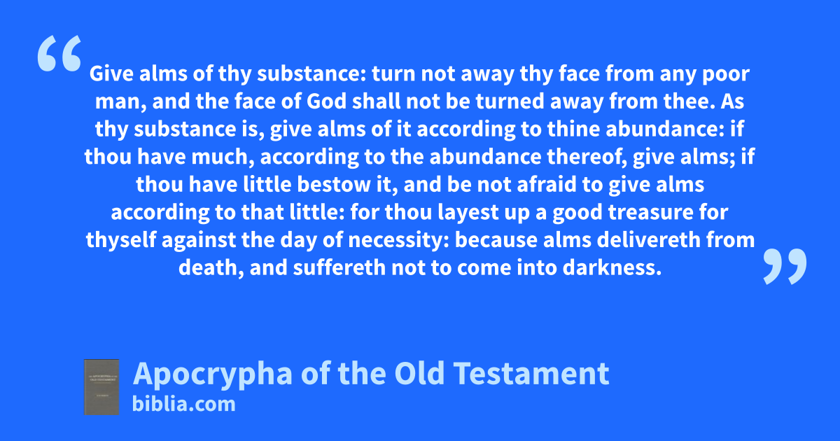 3 And he called Tobias his son and he came unto him and he said unto him, Bury me well, and honour thy mother; and forsake her not all the days of her life, and do that which is pleasing before her, and grieve not her spirit in any matter. 4 Remember her, child, that she hath experienced many dangers for thee in her womb; and when she is dead, bury her by me in one grave. 5 My child, be mindful of the Lord all thy days, and let not thy will be set to sin and to transgress his commandments: do acts of righteousness all the days of thy life, and walk not in the ways of unrighteousness. 6 〈 For if thou doest the truth, success shall be in thy works, and so it shall be unto all that do righteousness. 7 Give alms of thy substance: turn not away thy face from any poor man, and the face of God shall not be turned away from thee. 8 As thy substance is, give alms of it according to thine abundance: if thou have much, according to the abundance thereof, give alms; if thou have little bestow it, and be not afraid to give alms according to that little: 9 for thou layest up a good treasure for thyself against the day of necessity: 10 because alms delivereth from death, and suffereth not to come into darkness. 11 Alms is a good offering in the sight of the Most High for all that give it. 12 Beware, my child, of all whoredom, and take first a wife of the seed of thy fathers, take not a strange wife, which is not of thy father’s tribe; for we are the sons of the prophets. Noah, Abraham, Isaac, Jacob, our fathers of old time, remember, my child, that they all took wives of their kinsmen, and were blessed in their children, and their seed shall inherit the land. 13 And now, my child, love thy brethren, and scorn not in thy heart thy brethren and the sons and the daughters of thy people so as not to take one of them; for in scornfulness is destruction and much trouble, and in idleness is decay and great want, for idleness is the mother of famine. 14 Let not the wages of any man, which shall work for thee, tarry with thee, but render it unto him out of hand: and if thou serve God, recompense shall be made unto thee. Take heed to thyself, my child, in all thy works, and be discreet in all thy behaviour. 15 And what thou thyself hatest, do to no man. Drink not wine unto drunkenness, and let not drunkenness go with thee on thy way. 16 Give of thy bread to the hungry, and of thy garments to them that are naked: of all thine abundance give alms; and let not thine eye be grudging when thou givest alms. 17 Pour out thy bread and thy wine on the tomb of the just, and give not to sinners. 18 Ask counsel of every man that is wise, and despise not any counsel that is profitable. 19 And bless the Lord thy God at all times, and ask of him that thy ways may be made straight, and that all thy paths and counsels may prosper: for every nation hath not good counsel; 〈but〉 the Lord will give to them 〈all good things〉; and whom he will the Lord humbleth unto the nethermost Hades. And now, child, remember these commandments, and let them not be blotted out of thy heart. 20 And now, child, I shew thee that I left ten talents of silver in trust with Gabael the brother of Gabri at Rages of Media. 21 And fear not, my child, because we have become poor: thou hast much wealth, if thou fear God and avoid every kind of sin and do the things which are good in the sight of the Lord thy God.