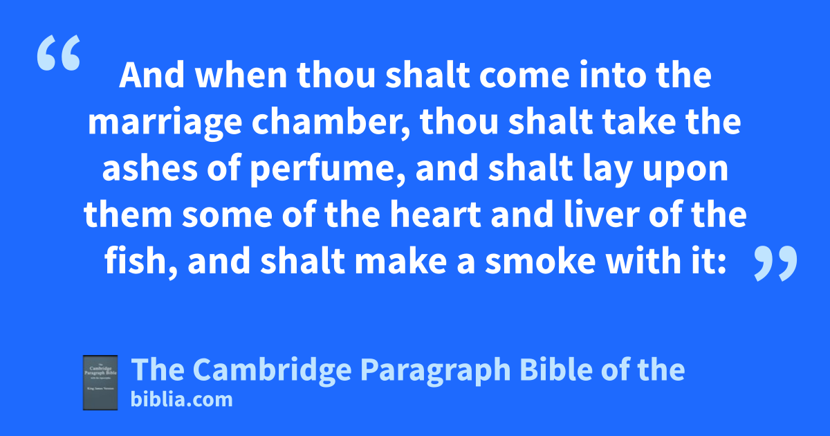 9 And when they were come near to dRages, 10 the angel said to the young man, Brother, to day we shall lodge with eRaguel, who is thy cousin; he also hath fone only daughter, named Sara; I will speak for her, that she may be given thee for a wife. 11 For to thee doth the * gright of her appertain, seeing thou only art of her kindred. 12 And the maid is fair and wise: now therefore hear me, and I will speak to her father; and when we return from dRages we will celebrate the marriage: for I know that Raguel cannot marry her to another according gto the law of Moses, but hhe shall be guilty of death, because the right of inheritance doth rather appertain to thee than to any other. 13 Then the young man answered the angel, I have heard, brother Azarias, that this maid hath been given to seven men, who all died in ithe marriage chamber. 14 And now I am the only son of my father, and I am afraid, lest, if I go in unto her, I die, as the other before: for a jwicked spirit loveth her, which hurteth no body, kbut those which come unto her: wherefore I also fear lest I die, and lbring my father’s and my mother’s life, because of me, to the grave with sorrow: for they have no other son to bury them. 15 Then the angel said unto him, Dost thou not remember the precepts which thy father gave thee, mthat thou shouldest marry a wife of thine own kindred? wherefore hear me, O my brother; for she shall be given thee to wife; and make thou no reckoning of jthe evil spirit; for this same night shall she be given thee in marriage. 16 And when thou shalt come into ithe marriage chamber, thou shalt take the * ashes of perfume, and shalt lay upon them some of the heart and liver of the fish, and shalt make a smoke with it: 17 and jthe devil shall smell it, and flee away, and never come again any more: but when thou shalt come to her, rise up both of you, and pray to God which is merciful, who will have pity on you, and save you: fear not, for she is appointed unto thee from the beginning; and thou shalt preserve her, and she shall go with thee. Moreover I suppose that she shall bear thee children. Now when Tobias had heard these things, he loved her, and his heart was * effectually joined to her.