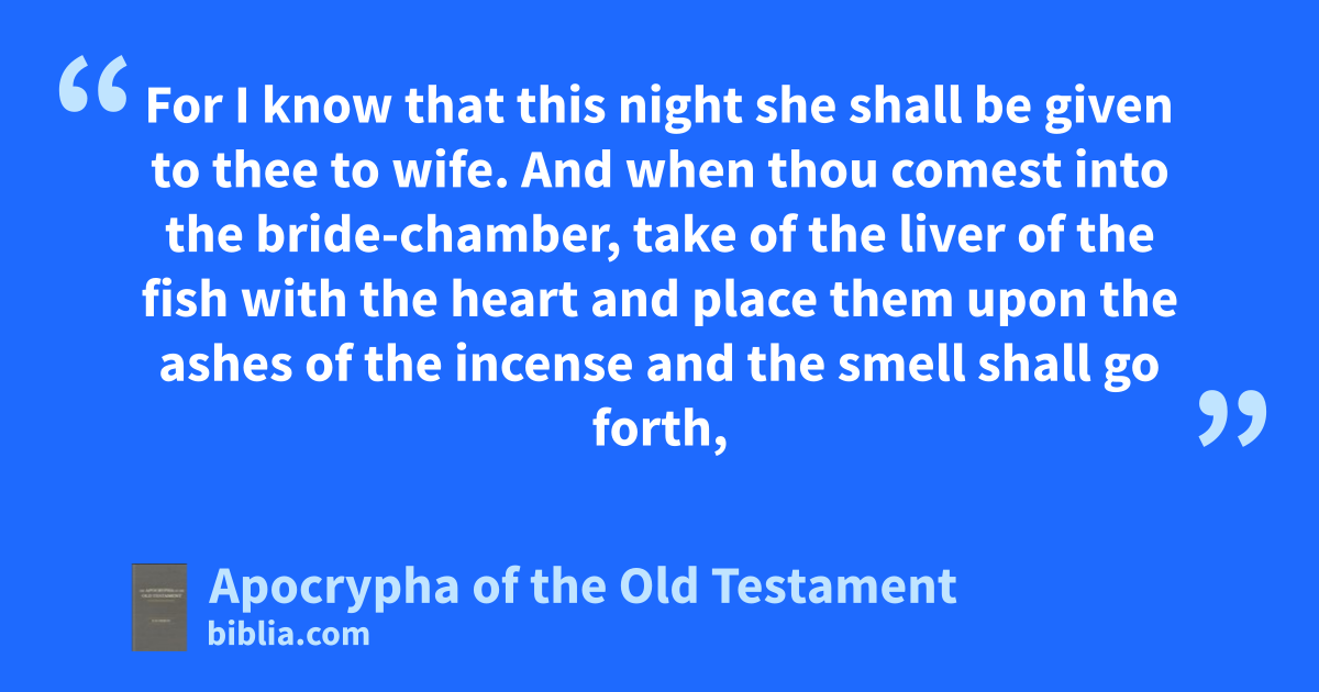 10(9) And when he had entered into Media and was already drawing nigh to Ecbatana, 11(10) Raphael saith unto the young man, Brother Tobias. And he said unto him, Here am I. And he said unto him, In the house of Raguel we must lodge this night, the man being thy kinsman; and he hath a daughter whose name is Sarah. 12(11) And he hath no son nor daughter but Sarah alone, and thou art nearer kin to her than any man to inherit her, and what things are her father’s it is right for thee to inherit; and the maid is wise and steadfast and exceeding honourable, (12)and her father is an honourable man. 13 And he said, It is right for thee to take her; and hear me, brother, and I will speak this night unto her father concerning the maid, that we may take her to be thy bride. And when we return from Rages we will celebrate her marriage. And I know that Raguel can in no wise keep her back from thee or marry her to another—to incur liability to death according to the decree of the book of Moses—and because he knoweth that the inheritance appertaineth to thee to take his daughter before any man. And now, hear me, brother, and let us speak concerning the maid this night and we will betroth her to thee; and, when we return from Rages, we will take her and let us lead her back with us to thy home. 14(13) Then Tobias answered and said unto Raphael, Brother Azarias, I have heard that already the maid hath been given to seven men, and they have died in their bridal-chambers; even in the night when they went in unto her they died. And I have heard them say that a demon slayeth them. 15(14) And now for my part I fear—for her he harmeth not, but the man who would come in unto her, him he slayeth, and I am my father’s only child—lest I should die and bring my father’s and my mother’s life to the grave with sorrow because of me: and they have no other son to bury them. 16(15) And he saith unto him, Dost thou not remember the commands of thy father, that he commanded thee to take a wife of thy father’s house? And now hear me, brother; and make thou no reckoning of this demon, but take her. 17(16) For I know that this night she shall be given to thee to wife. And when thou comest into the bride-chamber, take of the liver of the fish with the heart and place them upon the ashes of the incense and the smell shall go forth, 18(17) and the devil shall smell it, and flee away, and never appear any more to her. And when thou art about to be with her, rise up both of you first and pray and supplicate the Lord of heaven that mercy and deliverance may be extended to you. And fear not, for she was set apart for thee before the world was; and thou shalt save her, and she shall go with thee. And I suppose that thou shalt have children of her and they shall be as brothers unto thee. Take no reckoning. And when Tobias heard the words of Raphael, and that she was his sister of the seed of his father’s house, he loved her exceedingly, and his heart clave unto her.