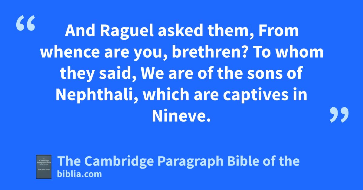 VII. And when they were come to aEcbatane, they came to the house of Raguel, and Sara met them: and after that they had saluted one another, she brought them into the house. 2 Then said Raguel to Edna his wife, How like is this young man to Tobit my cousin! 3 And Raguel asked them, From whence are you, brethren? To whom they said, We are bof the sons of Nephthali, which are captives in Nineve. 4 Then he said to them, Do ye know Tobit our kinsman? And they said, We know him. cThen said he, Is he in good health? 5 And they said, He is both alive, and in good health: and Tobias said, He is my father. 6 Then Raguel leaped up, and kissed him, and wept, 7 and blessed him, and said unto him, Thou art the son of dan honest and good man. But when he had heard that Tobit was blind, he was sorrowful, and wept. 8 And likewise Edna his wife and Sara his daughter wept. Moreover they eentertained them cheerfully; and after that they had killed * a ram of the flock, they set store of meat on the table. Then said Tobias to fRaphael, Brother Azarias, speak of those things of which thou didst talk in the way, and let this business be dispatched. 9 So he communicated the matter with Raguel: and Raguel said to Tobias, Eat and drink, and make merry: 10 for it is meet that thou shouldest marry my daughter: nevertheless I will declare unto thee the truth. 11 I have given my daughter in marriage to seven men, who died that night they came in unto her: nevertheless for the present be merry. But Tobias said, I will eat nothing here, till we agree and swear one to another. 12 Raguel said, Then take her from henceforth gaccording to the * manner, for thou art her cousin, and she is thine, and the merciful God give you good success in all things. 13 Then he called his daughter Sara, and she came to her father, and he took her by the hand, and gave her to be wife to Tobias, saying, Behold, take her hafter the law of Moses, and lead her away to thy father. And he blessed them; 14 and called iEdna his wife, and took kpaper, and did write an instrument of covenants, and lsealed it. 15 Then they began to eat. 16 After Raguel called his wife Edna, and said unto her, mSister, prepare another nchamber, and bring her in thither. 17 Which when she had done as he had bidden her, she brought her thither: and she wept, and she * received the tears of her daughter, and said unto her, 18 oBe of good comfort, my daughter; the Lord of heaven and earth give thee joy for this thy sorrow: obe of good comfort, my daughter.