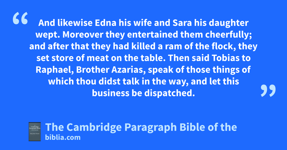VII. And when they were come to aEcbatane, they came to the house of Raguel, and Sara met them: and after that they had saluted one another, she brought them into the house. 2 Then said Raguel to Edna his wife, How like is this young man to Tobit my cousin! 3 And Raguel asked them, From whence are you, brethren? To whom they said, We are bof the sons of Nephthali, which are captives in Nineve. 4 Then he said to them, Do ye know Tobit our kinsman? And they said, We know him. cThen said he, Is he in good health? 5 And they said, He is both alive, and in good health: and Tobias said, He is my father. 6 Then Raguel leaped up, and kissed him, and wept, 7 and blessed him, and said unto him, Thou art the son of dan honest and good man. But when he had heard that Tobit was blind, he was sorrowful, and wept. 8 And likewise Edna his wife and Sara his daughter wept. Moreover they eentertained them cheerfully; and after that they had killed * a ram of the flock, they set store of meat on the table. Then said Tobias to fRaphael, Brother Azarias, speak of those things of which thou didst talk in the way, and let this business be dispatched. 9 So he communicated the matter with Raguel: and Raguel said to Tobias, Eat and drink, and make merry: 10 for it is meet that thou shouldest marry my daughter: nevertheless I will declare unto thee the truth. 11 I have given my daughter in marriage to seven men, who died that night they came in unto her: nevertheless for the present be merry. But Tobias said, I will eat nothing here, till we agree and swear one to another. 12 Raguel said, Then take her from henceforth gaccording to the * manner, for thou art her cousin, and she is thine, and the merciful God give you good success in all things. 13 Then he called his daughter Sara, and she came to her father, and he took her by the hand, and gave her to be wife to Tobias, saying, Behold, take her hafter the law of Moses, and lead her away to thy father. And he blessed them; 14 and called iEdna his wife, and took kpaper, and did write an instrument of covenants, and lsealed it. 15 Then they began to eat. 16 After Raguel called his wife Edna, and said unto her, mSister, prepare another nchamber, and bring her in thither. 17 Which when she had done as he had bidden her, she brought her thither: and she wept, and she * received the tears of her daughter, and said unto her, 18 oBe of good comfort, my daughter; the Lord of heaven and earth give thee joy for this thy sorrow: obe of good comfort, my daughter.