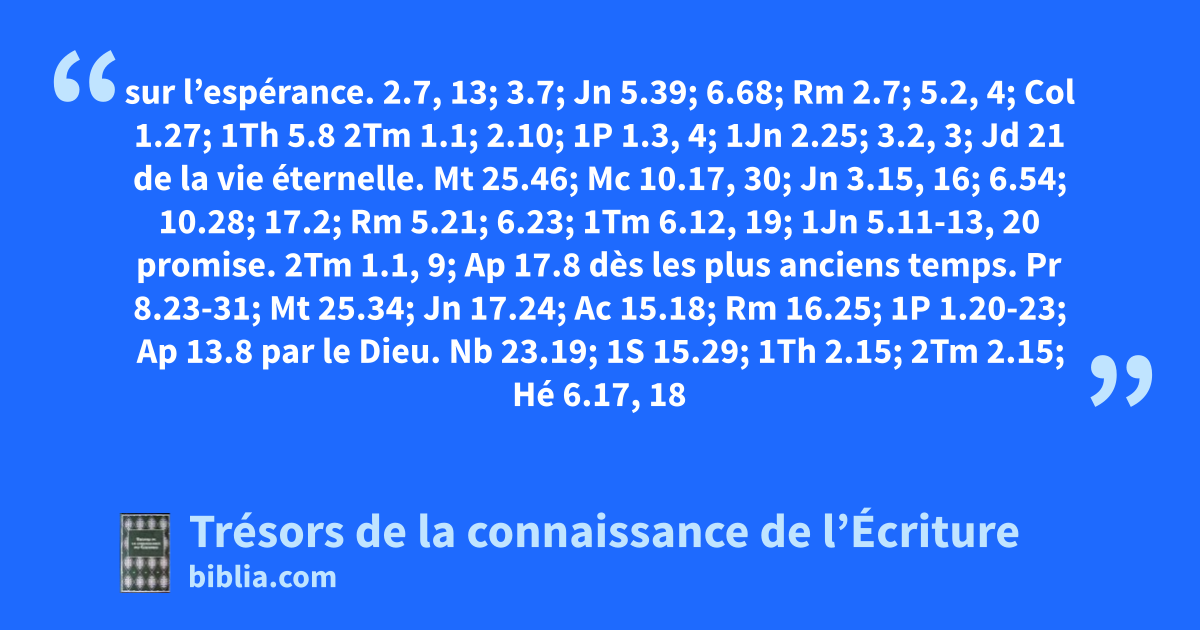 sur l’espérance. 2.7, 13; 3.7; Jn 5.39; 6.68; Rm 2.7; 5.2, 4; Col 1.27; 1Th 5.8 2Tm 1.1; 2.10; 1P 1.3, 4; 1Jn 2.25; 3.2, 3; Jd 21 de la vie éternelle. Mt 25.46; Mc 10.17, 30; Jn 3.15, 16; 6.54; 10.28; 17.2; Rm 5.21; 6.23; 1Tm 6.12, 19; 1Jn 5.11-13, 20 promise. 2Tm 1.1, 9; Ap 17.8 dès les plus anciens temps. Pr 8.23-31; Mt 25.34; Jn 17.24; Ac 15.18; Rm 16.25; 1P 1.20-23; Ap 13.8 par le Dieu. Nb 23.19; 1S 15.29; 1Th 2.15; 2Tm 2.15; Hé 6.17, 18
