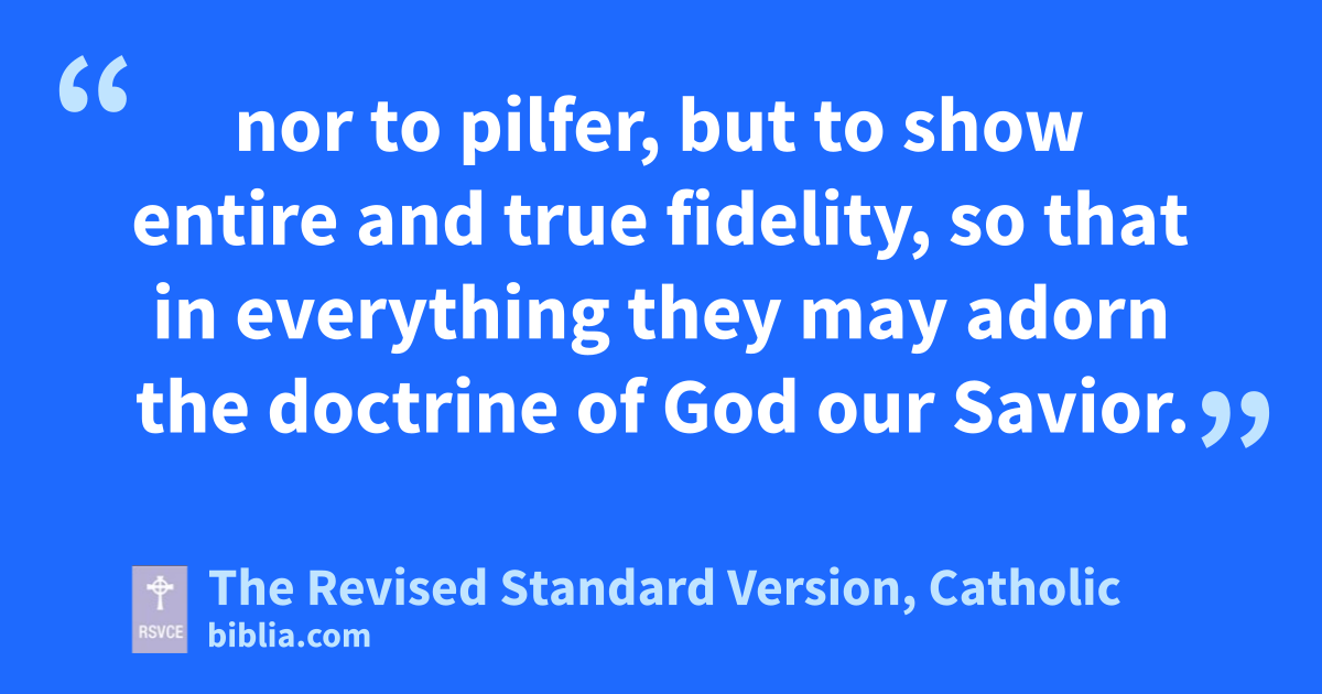 1 But as for you, teach what befits sound doctrine. 2 Bid the older men be temperate, serious, sensible, sound in faith, in love, and in steadfastness. 3 Bid the older women likewise to be reverent in behavior, not to be slanderers or slaves to drink; they are to teach what is good, 4 and so train the young women to love their husbands and children, 5 to be sensible, chaste, domestic, kind, and submissive to their husbands, that the word of God may not be discredited. 6 Likewise urge the younger men to control themselves. 7 Show yourself in all respects a model of good deeds, and in your teaching show integrity, gravity, 8 and sound speech that cannot be censured, so that an opponent may be put to shame, having nothing evil to say of us. 9 Bid slaves to be submissive to their masters and to give satisfaction in every respect; they are not to be refractory, 10 nor to pilfer, but to show entire and true fidelity, so that in everything they may adorn the doctrine of God our Savior.