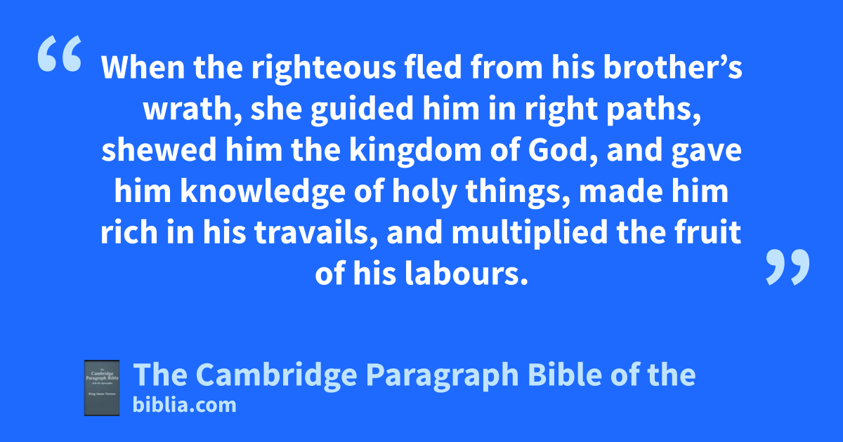 X. She preserved the afirst formed father of the world, that was created alone, and brought him out of his fall, 2 and bgave him power to rule all things. 3 But cwhen the unrighteous went away from her in his anger, che perished also in the fury wherewith he murdered his brother. 4 For whose cause dthe earth being drowned with the flood, ewisdom again preserved it, and directed the course of fthe righteous gin a piece of wood of small value. 5 Moreover, hthe nations in their wicked conspiracy being confounded, ishe found out the righteous, and preserved him kblameless unto God, and lkept him strong * against his tender compassion toward his son. 6 mWhen the ungodly perished, she delivered nthe righteous man, who fled from the fire which fell down upon * the ofive cities. 7 Of whose wickedness even to this day the waste land that smoketh is a testimony, and plants bearing fruit that never come to ripeness: and pa standing pillar of salt is a monument of an unbelieving soul. 8 For regarding not wisdom, they gat not only this hurt, that they knew not the things which were good; but also left behind them to the world a memorial of their foolishness: so that in the things wherein they offended they could not so much as be hid. 9 But wisdom delivered from pain those that attended upon her. 10 When qthe righteous fled from his brother’s wrath, she guided him in right paths, rshewed him the kingdom of God, and gave him knowledge of holy things, smade him rich in his travails, and multiplied the fruit of his labours. 11 tIn the covetousness of such as oppressed him she stood by him, and made him rich. 12 uShe defended him from his enemies, and kept him safe from those that lay in wait, and xin a sore conflict she gave him the victory; that he might know that godliness is stronger than all. 13 yWhen the righteous was sold, she forsook him not, but zdelivered him from sin: ashe went down with him into the pit, 14 and bleft him not in bonds, till she brought him the sceptre of the kingdom, and * cpower against those that oppressed him: as for dthem that had accused him, she shewed them to be liars, and gave him perpetual glory. 15 eShe delivered the * righteous people and fblameless seed from the nation that oppressed them. 16 gShe entered into the soul of hthe servant of the Lord, and iwithstood dreadful kings iin wonders and signs; 17 jrendered to the * righteous a reward of their labours, guided them in a marvellous way, and was unto them for ka cover by day, and la * light of stars in the night-season; 18 mbrought them through the Red sea, and led them through much water: 19 nbut she drowned their enemies, and ocast them up out of the bottom of the deep. 20 Therefore pthe righteous spoiled the ungodly, and qpraised thy holy name, O Lord, and magnified with one accord thine hand, that fought for them. 21 For wisdom opened the mouth of the dumb, and made the tongues of them that cannot speak reloquent.