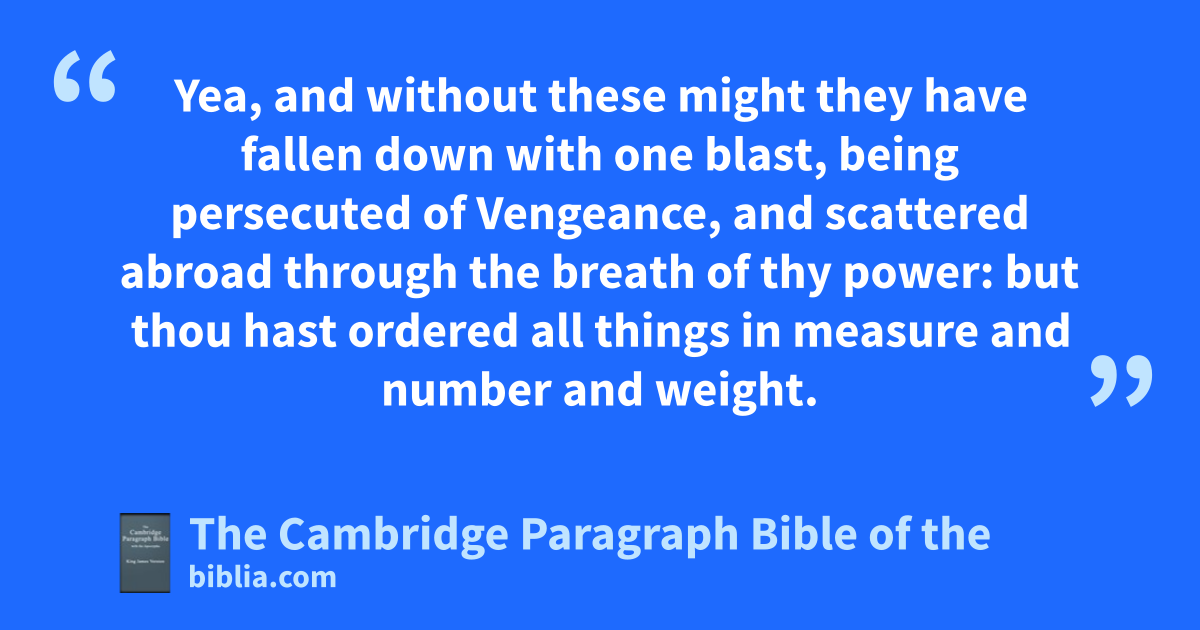 5 For by what things their enemies were punished, by the same they in their need were benefited. 6 For instead of a fountain of a perpetual running river etroubled with foul blood, 7 for a manifest reproof of fthat commandment, whereby the infants were slain, thou gavest unto them abundance of water gby a means which they hoped not for: 8 declaring by that thirst then hhow thou hadst punished their adversaries. 9 For when they were tried, albeit but in mercy chastised, they knew how the ungodly were judged in wrath and tormented, ithirsting in another manner than the just. 10 For these thou didst admonish and try, jas a father: but the other, as a severe king, thou didst condemn and punish. 11 Whether they were absent or present, they were vexed alike. 12 For a double grief came upon them, and a groaning for the remembrance of things past. 13 For when they heard by their own punishments the other to be benefited, kthey * had some feeling of the Lord. 14 For whom they rejected with scorn, lwhen he was long before thrown out at the casting forth of the infants, him in the end, mwhen they saw what came to pass, they admired. 15 But for the foolish devices of their wickedness, wherewith being deceived they worshipped nserpents void of reason, and ovile beasts, pthou didst send a multitude of unreasonable beasts upon them for vengeance; 16 that they might know, that qwherewithal a man sinneth, by the same also shall he be punished. 17 For thy Almighty hand, that made the world rof matter without form, wanted not means sto send among them a multitude of bears, or fierce lions, 18 or unknown wild beasts, tfull of rage, newly created, breathing out either a fiery vapour, or filthy sents of scattered smoke, or shooting horrible sparkles out of their eyes: 19 whereof not only the harm might dispatch them at once, but also the terrible sight utterly destroy them. 20 Yea, and without these might they have fallen down with one blast, being persecuted of uVengeance, and scattered abroad through vthe breath of thy power: but thou hast ordered all things in wmeasure and wwnumber and weight. 21 For thou canst shew thy great strength at all times when thou wilt; and xwho may withstand the power of thine arm? 22 For the whole world before thee is as a * little grain of the balance, yea, yas a drop of the morning dew that falleth down upon the earth. 23 But thou hast mercy upon all; for thou canst do all things, and zwinkest at the sins of men, because they should amend. 24 For thou lovest all the things that are, and abhorrest nothing which thou hast made: for never wouldest thou have made any thing, if thou hadst hated it. 25 And how could any thing have endured, if it had not been thy will? or been preserved, if not acalled by thee? 26 But bthou sparest all: for they are thine, O Lord, thou lover of souls.