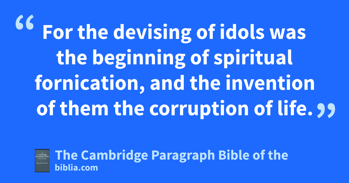 XIV. Again, one preparing himself to sail, and about to pass through the raging waves, calleth upon a piece of wood more rotten than the * vessel that carrieth him. 2 For verily desire of gain devised * that, and the workman built it by his skill. 3 But thy providence, O Father, governeth it: for thou ahast made a way in the sea, and a safe path in the waves; 4 shewing that thou canst save from all danger: yea, though a man went to sea without art. 5 Nevertheless thou wouldest not that the works of thy wisdom should be idle, and therefore do men commit their lives to a small piece of wood, and passing the rough sea bin a weak vessel are saved. 6 For in the old time also, cwhen the proud giants perished, the hope of the world governed by thy hand escaped in a weak vessel, and left to all ages a seed of generation. 7 For blessed is dthe wood whereby righteousness cometh. 8 But that which is made with hands is cursed, eas well it, as he that made it: he, because he made it; and it, because, being corruptible, it was called god. 9 For fthe ungodly and his ungodliness are both alike hateful unto God. 10 For that which is made shall be punished together with him that made it. 11 Therefore geven * upon the idols of the Gentiles shall there be a hvisitation: because in the creature of God they are become an abomination, and * istumblingblocks to the souls of men, and a * isnare to the feet of the unwise. 12 jFor the kdevising of idols was the beginning of spiritual fornication, and the invention of them the corruption of life. 13 For neither were they from the beginning, neither shall they be for ever.