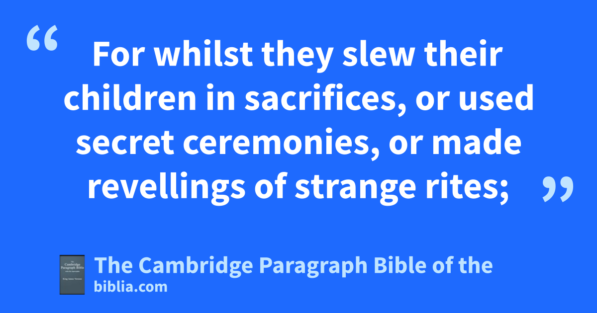 22 Moreover this was not enough for them, that they erred in the knowledge of God; but whereas they lived in the great war of ignorance, those so great plagues called they peace. 23 For whilst rthey slew their children in lsacrifices, or used secret lceremonies, or made srevellings of strange rites; 24 they kept neither lives nor marriages any longer undefiled: but either one slew another traiterously, or grieved him by adultery. 25 tSo that there reigned in all men * without exception blood, manslaughter, theft, and dissimulation, corruption, unfaithfulness, tumults, perjury, 26 disquieting of good men, uforgetfulness of good turns, defiling of souls, changing of * kind, disorder in marriages, vadultery, and wshameless uncleanness. 27 xFor the nworshipping of idols * not to be named is the beginning, the cause, and the end, of all evil. 28 For either they are mad when they be merry, or yprophesy lies, or live unjustly, or else lightly forswear themselves. 29 For zinsomuch as their trust is in idols, which have no life; though they swear falsely, yet they look not to be hurt. 30 Howbeit for both causes shall they be justly punished: both because they thought not well of God, * giving heed unto idols, and also unjustly swore in deceit, despising holiness. 31 For it is not the power of them by whom they swear: but it is the just vengeance of sinners, that punisheth always the offence of the ungodly.