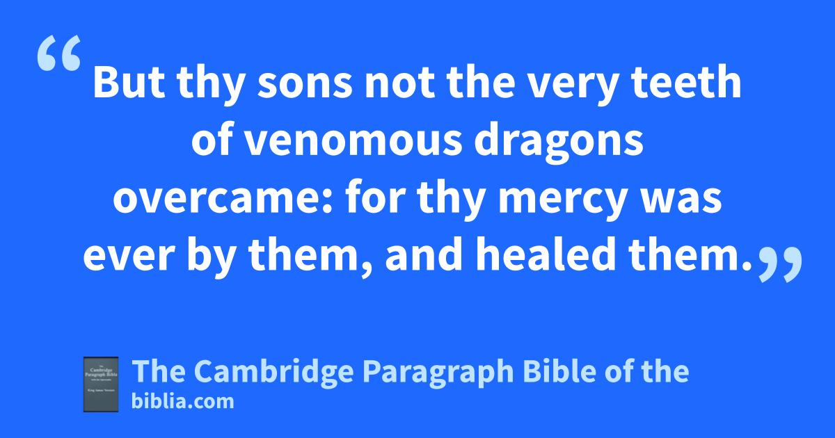 XVI. Therefore aby the like were they punished worthily, and by the multitude of beasts tormented. 2 Instead of which punishment, aadealing graciously with thine own people, thou preparedst for them meat of a strange taste, even bquails to stir up their appetite: 3 to the end that they, desiring food, might cfor the ugly sight of the beasts sent among them lothe even that, which they must needs desire; but these, suffering penury nfor a short space, might be made partakers of a strange taste. 4 For it was requisite, that upon them exercising tyranny should come penury, dwhich they could not avoid: but to these it should only be shewed how their enemies were tormented. 5 For when ethe horrible fierceness of beasts came upon * these, and fthey perished with the stings of crooked serpents, thy wrath endured not for ever: 6 but they were troubled nfor a small season, that they might be admonished, ghaving a sign of salvation, mto put them in remembrance of the commandment of thy law. 7 For he that turned himself towards it was not saved by the thing that he saw, hbut by thee, that art ithe Saviour of all. 8 And in this thou madest thine enemies confess, that it is thou who deliverest from all evil: 9 for them the bitings of jgrasshoppers and kflies killed, neither was there found any remedy for their life: lfor they were worthy to be punished by such. 10 But thy sons not the very teeth of venomous dragons overcame: for thy mercy was ever by them, and healed them. 11 For they were * pricked, mthat they should remember thy words; and were nquickly saved, that not falling into deep forgetfulness, they might be * continually mindful of thy goodness. 12 For it was neither herb, nor omollifying plaister, that restored them to health: but pthy word, O Lord, which healeth all things. 13 qFor thou hast power of life and death: rthou leadest to the gates of hell, and bringest up again.