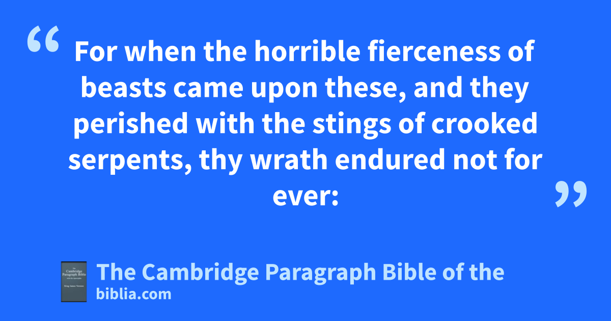 XVI. Therefore aby the like were they punished worthily, and by the multitude of beasts tormented. 2 Instead of which punishment, aadealing graciously with thine own people, thou preparedst for them meat of a strange taste, even bquails to stir up their appetite: 3 to the end that they, desiring food, might cfor the ugly sight of the beasts sent among them lothe even that, which they must needs desire; but these, suffering penury nfor a short space, might be made partakers of a strange taste. 4 For it was requisite, that upon them exercising tyranny should come penury, dwhich they could not avoid: but to these it should only be shewed how their enemies were tormented. 5 For when ethe horrible fierceness of beasts came upon * these, and fthey perished with the stings of crooked serpents, thy wrath endured not for ever: 6 but they were troubled nfor a small season, that they might be admonished, ghaving a sign of salvation, mto put them in remembrance of the commandment of thy law. 7 For he that turned himself towards it was not saved by the thing that he saw, hbut by thee, that art ithe Saviour of all. 8 And in this thou madest thine enemies confess, that it is thou who deliverest from all evil: 9 for them the bitings of jgrasshoppers and kflies killed, neither was there found any remedy for their life: lfor they were worthy to be punished by such. 10 But thy sons not the very teeth of venomous dragons overcame: for thy mercy was ever by them, and healed them. 11 For they were * pricked, mthat they should remember thy words; and were nquickly saved, that not falling into deep forgetfulness, they might be * continually mindful of thy goodness. 12 For it was neither herb, nor omollifying plaister, that restored them to health: but pthy word, O Lord, which healeth all things. 13 qFor thou hast power of life and death: rthou leadest to the gates of hell, and bringest up again.