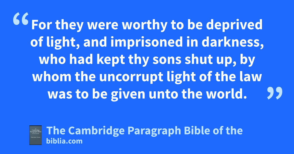 XVIII. aNevertheless thy hsaints had a very great light, whose voice they bhearing, and not seeing their shape, because they also had not suffered the same things, they counted them happy. 2 But for that they did not hurt them now, of whom they had been wronged before, they thanked them, and besought them pardon for that they chad been enemies. 3 Instead whereof dthou gavest them a burning pillar of fire, both to be a guide of the unknown journey, and a eharmless sun to entertain them honourably. 4 fFor they were worthy to be deprived of light, and imprisoned in darkness, who had kept thy sons shut up, by whom the * uncorrupt light of the law was to be given unto the world.
