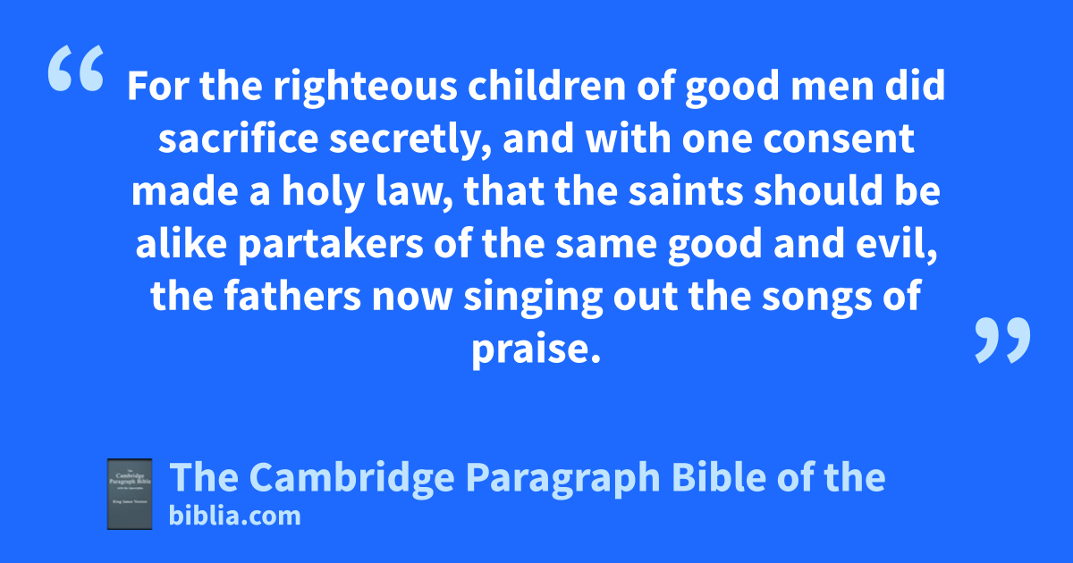5 And gwhen they had determined to slay the babes of hthe saints, ione child being cast forth, and saved, to reprove them, kthou tookest away the multitude of their children, and ldestroyedst them altogether in a mighty water. 6 mOf that night were our fathers certified afore, that nassuredly knowing ounto what oaths they had given credence, they might afterwards be of good cheer. 7 So of thy people was accepted both the salvation of the righteous, and destruction of the enemies. 8 For pwherewith thou didst punish our adversaries, qby the same thou didst glorify us, whom thou hadst called. 9 For the hrighteous children of good men rdid sacrifice ssecretly, and with one consent made * a holy law, that the saints should be alike partakers of the same good and evil, the fathers now singing out the songs of praise. 10 But on the other side there sounded tan ill according cry of the enemies; and a lamentable noise was carried abroad for children that were bewailed. 11 uThe master and the servant were punished after one manner; and like as the king, so suffered the common person. 12 tSo they altogether had innumerable dead with one kind of death; neither were the living sufficient to bury them: for in one moment the noblest offspring of them was destroyed. 13 For whereas they would not believe any thing wby reason of the enchantments; upon the destruction of the firstborn, xthey acknowledged this people to be the sons of God. 14 For while all things were in quiet silence, and kthat night was in the midst of her swift course, 15 kthine Almighty word leapt down from heaven yout of thy royal throne, as za fierce man of war into the midst of a land of destruction, 16 and brought thine aunfeigned commandment as ba sharp sword, and standing up filled all things with death; and cit touched the heaven, but it stood upon the earth. 17 Then suddenly * dvisions of horrible dreams troubled them sore, and terrors came upon them unlooked for. 18 And one thrown here, another there, half dead, shewed the cause of his death. 19 For the dreams that troubled them did foreshew this, lest they should perish, and not know why they were afflicted.