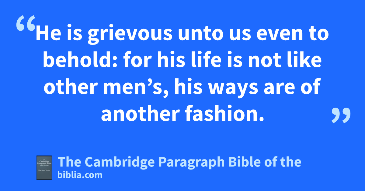 II. For athe ungodly said, reasoning with themselves, but not aright, bOur life is short and tedious, and cin the death of a man there is no remedy: neither was there any man known to have dreturned from the grave. 2 For we are born at all adventure: and ewe shall be hereafter as though we had never been: for the breath in our nostrils is as fsmoke, and a little spark in the moving of our heart: 3 which being extinguished, gour body shall be turned into ashes, and our spirit shall vanish as the * soft air, 4 and hour name shall be forgotten in time, and no man shall have our works in remembrance, and iour life shall pass away as the trace of a cloud, and shall be dispersed as a mist, that is driven away with the beams of the sun, and * overcome with the heat thereof. 5 For our time is ja very shadow that passeth away; and after our end there is no returning: for * it is kfast sealed, so that no man cometh again. 6 Come on therefore, llet us enjoy the good things that are present: and let us * speedily use the creatures like as in youth. 7 Let us fill ourselves with costly wine and ointments: and let no flower of the spring pass by us: 8 let us llcrown ourselves with rosebuds, before they be withered: 9 let none of us go without his part of our * voluptuousness: let us leave tokens of our joyfulness in every place: mfor this is our portion, and our lot is this. 10 Let us oppress the poor righteous man, let us not spare the widow, nor reverence the ancient gray hairs of the aged. 11 Let our strength be the law of justice: for that which is feeble nis found to be nothing worth. 12 Therefore olet us lie in wait for the righteous; because he is not for our turn, and he is clean contrary to our doings: he upbraideth us with our offending the law, and objecteth to our infamy the transgressings of our education. 13 He professeth to have the knowledge of God: and he calleth himself the child of the Lord. 14 pHe was made qto reprove our thoughts. 15 rHe is grievous unto us even to behold: for his life is not like other men’s, his ways are of another fashion. 16 We are esteemed of him as * scounterfeits: he abstaineth from our ways as from filthiness: the pronounceth the end of the just to be blessed, and umaketh his boast that God is his father. 17 Let us see if his words be true: and let us prove what shall happen in wthe end of him. 18 For xif the just man be uthe son of God, he will help him, and deliver him from the hand of his enemies. 19 yLet us examine him with despitefulness and torture, that we may know his zmeekness, and prove his apatience. 20 Let us condemn him with a shameful death: for bby his own saying he shall be crespected.