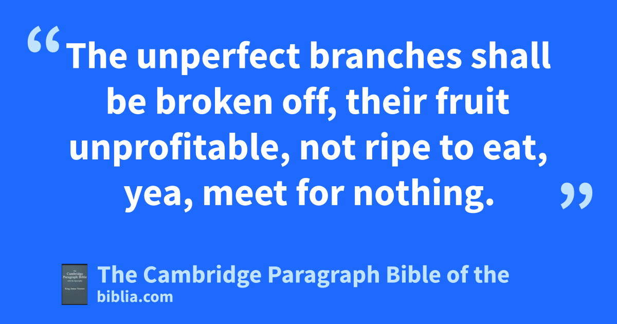 IV. Better it is to have no children, and to have virtue: for the memorial thereof is immortal: because it is * known awith God, and with men. 2 When it is present, men take example at it; and when it is gone, they desire it: bit weareth a crown, and triumpheth for ever, having gotten the victory, cstriving for undefiled rewards. 3 But the multiplying brood of the ungodly shall not thrive, dnor take deep rooting from bastard slips, nor lay any fast foundation. 4 For ethough they flourish in branches for a time; yet standing not fast, ethey shall be shaken with the wind, and through the force of winds they shall be rooted out. 5 The funperfect branches gshall be broken off, their fruit unprofitable, not ripe to eat, yea, meet for nothing. 6 hFor children begotten of unlawful * beds are witnesses of wickedness against their parents in their trial.