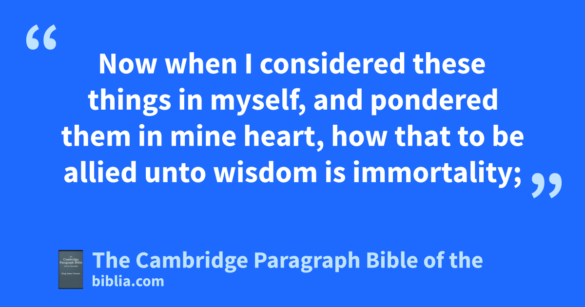 17 Now when I considered these things in myself, and rpondered them in mine heart, how that to be allied unto wisdom ois immortality; 18 and great pleasure it is to have her friendship; and in the works of her hands are infinite riches; and in the exercise of conference with her, prudence; and in talking with her, a * good report; I went about seeking how to * take her to me. 19 For I was a witty child, and had a good spirit. 20 Yea rather, being good, sI came into a body undefiled. 21 Nevertheless, when I perceived that I could not otherwise tobtain her, except God gave her me; and that was a point of wisdom also to know whose gift she was; I * uprayed unto the Lord, and besought him, and with my whole heart I said,