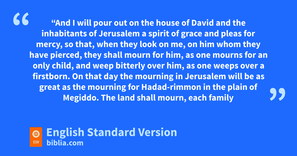 10 “And zI will pour out on the house of David and the inhabitants of Jerusalem a spirit of grace and zpleas for mercy, so that, awhen they look on me, on him whom they have pierced, bthey shall mourn for him, cas one mourns for an only child, and weep bitterly over him, as one weeps over a firstborn. 11 oOn that day dthe mourning in Jerusalem will be as great eas the mourning for Hadad-rimmon in the plain of Megiddo. 12 The land shall mourn, feach family1 by itself: the family of the house of David by itself, and their wives by themselves; the family of the house of gNathan by itself, and their wives by themselves; 13 the family of the house of Levi by itself, and their wives by themselves; the family of hthe Shimeites by itself, and their wives by themselves; 14 and all the families that are left, each by itself, and their wives by themselves.