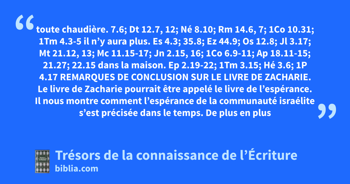 toute chaudière. 7.6; Dt 12.7, 12; Né 8.10; Rm 14.6, 7; 1Co 10.31; 1Tm 4.3-5 il n’y aura plus. Es 4.3; 35.8; Ez 44.9; Os 12.8; Jl 3.17; Mt 21.12, 13; Mc 11.15-17; Jn 2.15, 16; 1Co 6.9-11; Ap 18.11-15; 21.27; 22.15 dans la maison. Ep 2.19-22; 1Tm 3.15; Hé 3.6; 1P 4.17