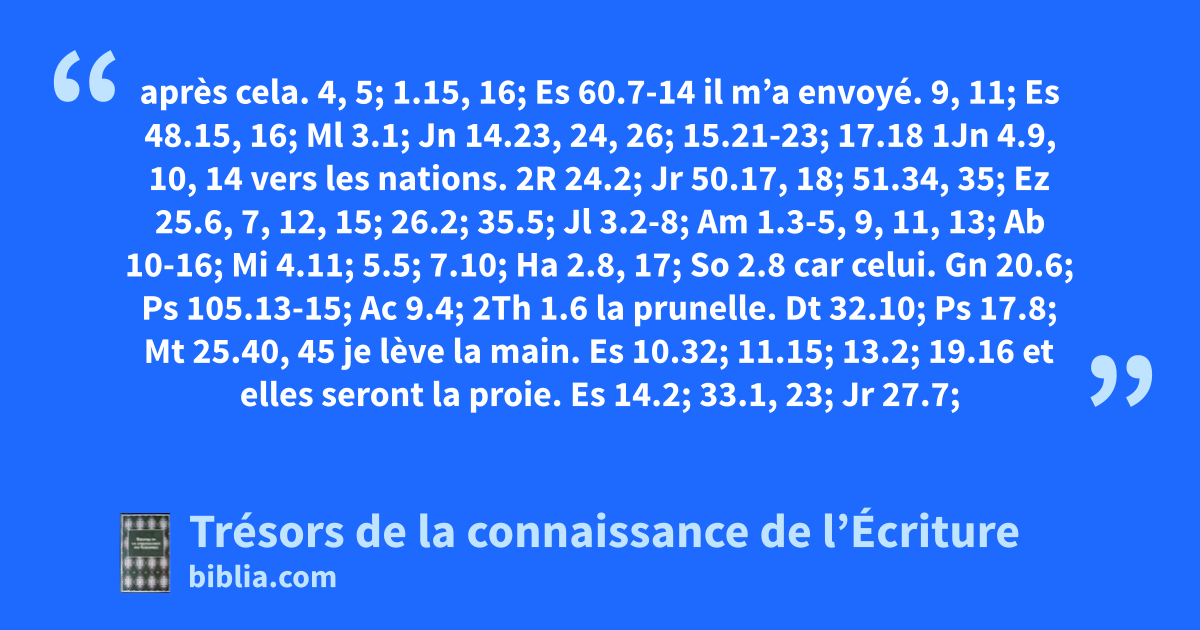 après cela. 4, 5; 1.15, 16; Es 60.7-14 il m’a envoyé. 9, 11; Es 48.15, 16; Ml 3.1; Jn 14.23, 24, 26; 15.21-23; 17.18 1Jn 4.9, 10, 14 vers les nations. 2R 24.2; Jr 50.17, 18; 51.34, 35; Ez 25.6, 7, 12, 15; 26.2; 35.5; Jl 3.2-8; Am 1.3-5, 9, 11, 13; Ab 10-16; Mi 4.11; 5.5; 7.10; Ha 2.8, 17; So 2.8 car celui. Gn 20.6; Ps 105.13-15; Ac 9.4; 2Th 1.6 la prunelle. Dt 32.10; Ps 17.8; Mt 25.40, 45
