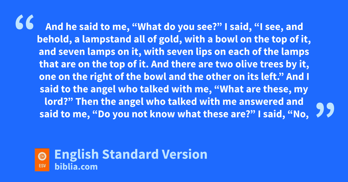 4 And fthe angel who talked with me came again gand woke me, like a man who is awakened out of his sleep. 2 And he said to me, “What do you see?” I said, “I see, and behold, ha lampstand all of gold, with a bowl on the top of it, and iseven lamps on it, with seven lips on each of the lamps that are on the top of it. 3 And there are jtwo olive trees by it, one on the right of the bowl and the other on its left.” 4 And I said to fthe angel who talked with me, “What are these, my lord?” 5 Then the angel who talked with me answered and said to me, k“Do you not know what these are?” I said, “No, my lord.” 6 Then he said to me, “This is the word of the Lord to lZerubbabel: mNot by might, nor by power, but by my Spirit, says the Lord of hosts. 7 Who are you, nO great mountain? Before lZerubbabel oyou shall become a plain. And he shall bring forward pthe top stone amid shouts of ‘Grace, grace to it!’ ”