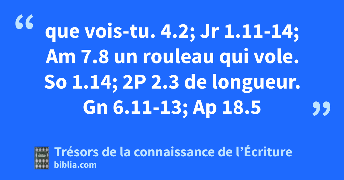 que vois-tu. 4.2; Jr 1.11-14; Am 7.8 un rouleau qui vole. So 1.14; 2P 2.3 de longueur. Gn 6.11-13; Ap 18.5