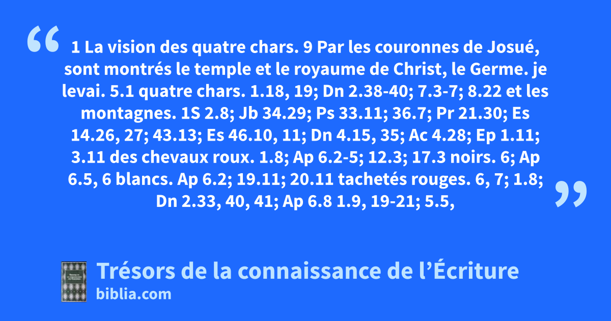 je levai. 5.1 quatre chars. 1.18, 19; Dn 2.38-40; 7.3-7; 8.22 et les montagnes. 1S 2.8; Jb 34.29; Ps 33.11; 36.7; Pr 21.30; Es 14.26, 27; 43.13; Es 46.10, 11; Dn 4.15, 35; Ac 4.28; Ep 1.11; 3.11