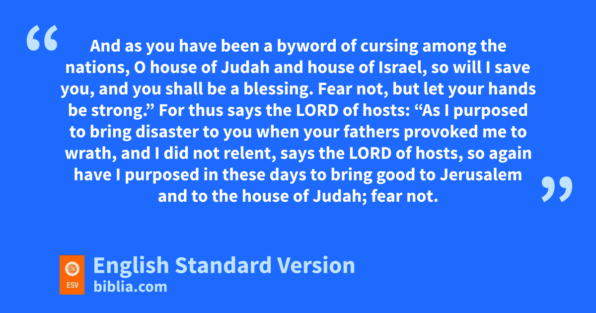 9 Thus says the Lord of hosts: e“Let your hands be strong, you who in these days have been hearing these words from the mouth of fthe prophets who were present on gthe day that the foundation of the house of the Lord of hosts was laid, that the temple might be built. 10 For before those days hthere was no wage for man or any wage for beast, neither was there any safety from the foe for him who went out or came in, for I set every man against his neighbor. 11 But now I will not deal with the remnant of this people as in the former days, declares the Lord of hosts. 12 iFor there shall be a sowing of peace. The vine shall give its fruit, and the ground shall give its produce, jand the heavens shall give their dew. kAnd I will cause the remnant of this people to possess all these things. 13 And as lyou have been a byword of cursing among the nations, O house of Judah and house of Israel, mso will I save you, and nyou shall be a blessing. oFear not, but elet your hands be strong.”