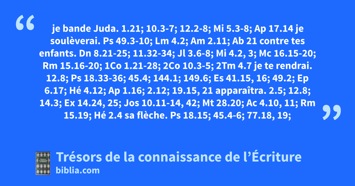 je bande Juda. 1.21; 10.3-7; 12.2-8; Mi 5.3-8; Ap 17.14 je soulèverai. Ps 49.3-10; Lm 4.2; Am 2.11; Ab 21 contre tes enfants. Dn 8.21-25; 11.32-34; Jl 3.6-8; Mi 4.2, 3; Mc 16.15-20; Rm 15.16-20; 1Co 1.21-28; 2Co 10.3-5; 2Tm 4.7 je te rendrai. 12.8; Ps 18.33-36; 45.4; 144.1; 149.6; Es 41.15, 16; 49.2; Ep 6.17; Hé 4.12; Ap 1.16; 2.12; 19.15, 21
