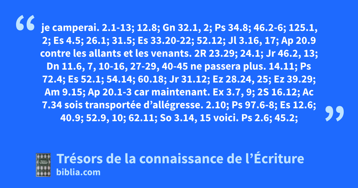 je camperai. 2.1-13; 12.8; Gn 32.1, 2; Ps 34.8; 46.2-6; 125.1, 2; Es 4.5; 26.1; 31.5; Es 33.20-22; 52.12; Jl 3.16, 17; Ap 20.9 contre les allants et les venants. 2R 23.29; 24.1; Jr 46.2, 13; Dn 11.6, 7, 10-16, 27-29, 40-45 ne passera plus. 14.11; Ps 72.4; Es 52.1; 54.14; 60.18; Jr 31.12; Ez 28.24, 25; Ez 39.29; Am 9.15; Ap 20.1-3 car maintenant. Ex 3.7, 9; 2S 16.12; Ac 7.34