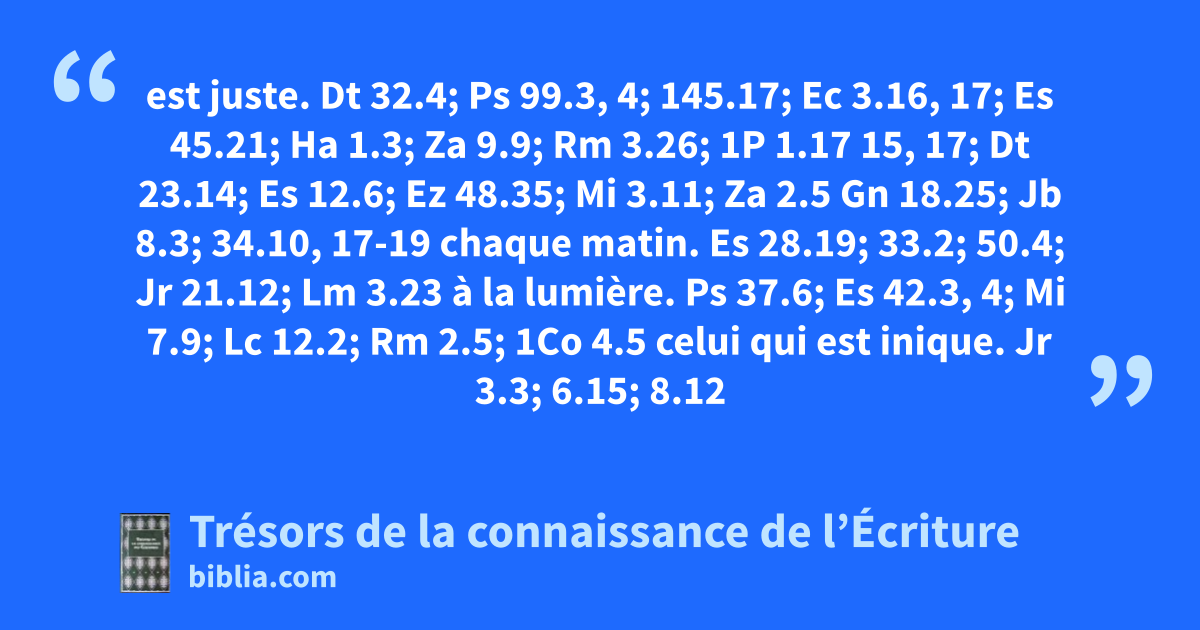 est juste. Dt 32.4; Ps 99.3, 4; 145.17; Ec 3.16, 17; Es 45.21; Ha 1.3; Za 9.9; Rm 3.26; 1P 1.17 15, 17; Dt 23.14; Es 12.6; Ez 48.35; Mi 3.11; Za 2.5 Gn 18.25; Jb 8.3; 34.10, 17-19 chaque matin. Es 28.19; 33.2; 50.4; Jr 21.12; Lm 3.23 à la lumière. Ps 37.6; Es 42.3, 4; Mi 7.9; Lc 12.2; Rm 2.5; 1Co 4.5 celui qui est inique. Jr 3.3; 6.15; 8.12