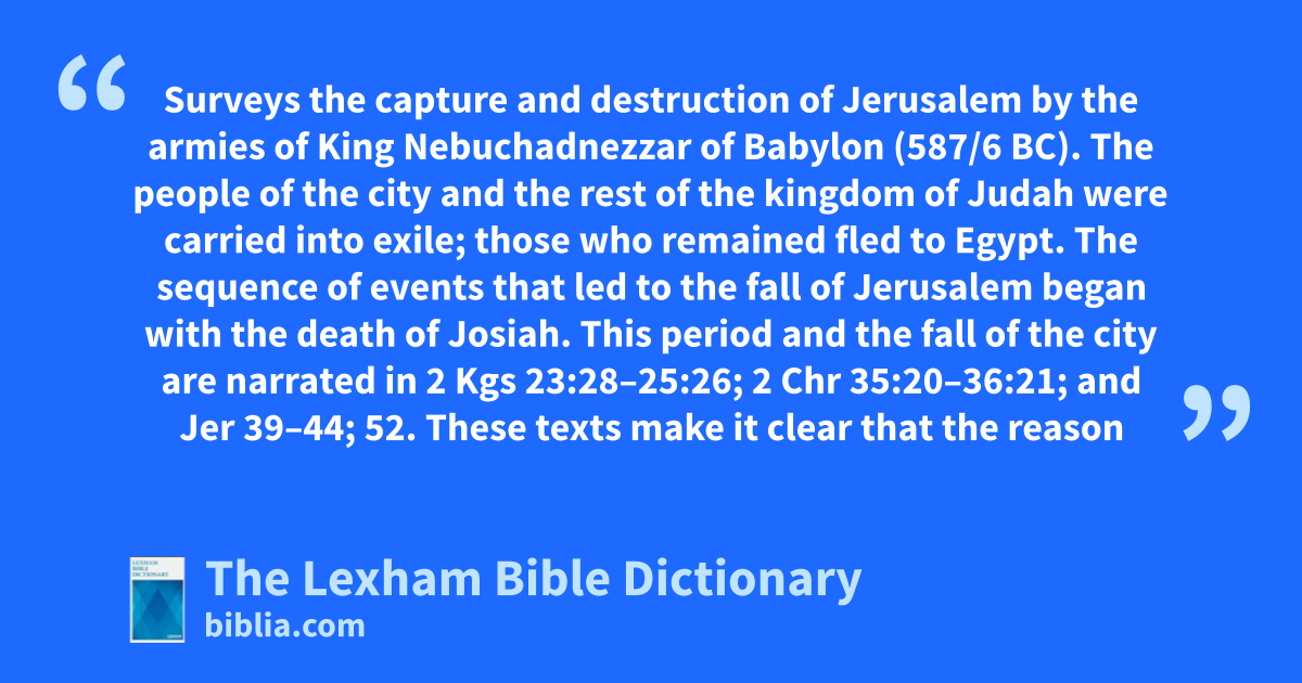 Jerusalem, Fall Of Surveys the capture and destruction of Jerusalem by the armies of King Nebuchadnezzar of Babylon (587/6 bc). The people of the city and the rest of the kingdom of Judah were carried into exile; those who remained fled to Egypt.