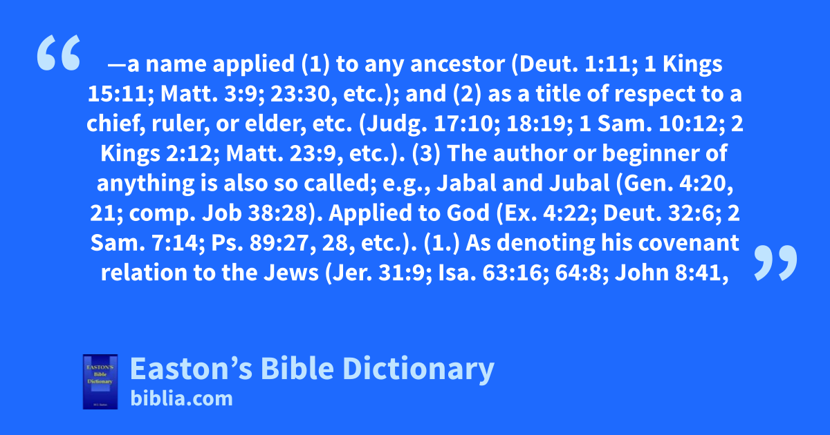 Father—a name applied (1) to any ancestor (Deut. 1:11; 1 Kings 15:11; Matt. 3:9; 23:30, etc.); and (2) as a title of respect to a chief, ruler, or elder, etc. (Judg. 17:10; 18:19; 1 Sam. 10:12; 2 Kings 2:12; Matt. 23:9, etc.). (3) The author or beginner of anything is also so called; e.g., Jabal and Jubal (Gen. 4:20, 21; comp. Job 38:28).
