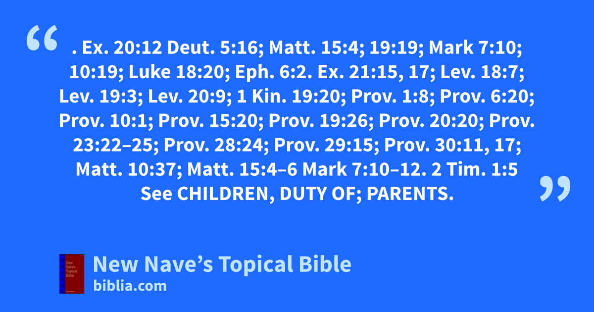 MOTHER. Ex. 20:12 Deut. 5:16; Matt. 15:4; 19:19; Mark 7:10; 10:19; Luke 18:20; Eph. 6:2. Ex. 21:15, 17; Lev. 18:7; Lev. 19:3; Lev. 20:9; 1 Kin. 19:20; Prov. 1:8; Prov. 6:20; Prov. 10:1; Prov. 15:20; Prov. 19:26; Prov. 20:20; Prov. 23:22–25; Prov. 28:24; Prov. 29:15; Prov. 30:11, 17; Matt. 10:37; Matt. 15:4–6 Mark 7:10–12. 2 Tim. 1:5 See Children, Duty of; Parents.